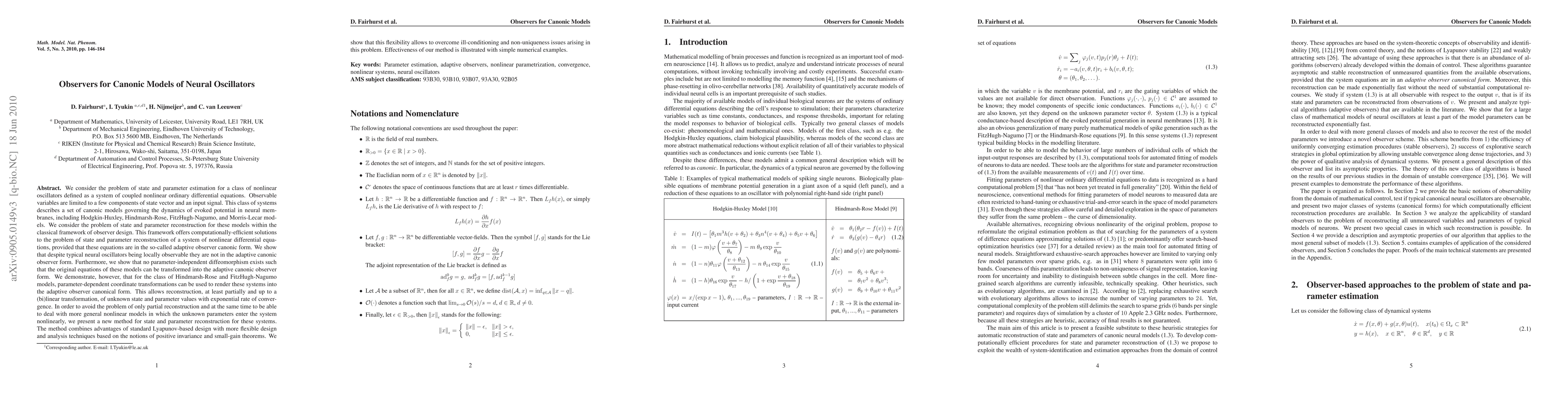 We consider the problem of state and parameter estimation for a wide class of nonlinear oscillators. Observable variables are limited to a few components of state vector and an input signal. The problem of state and parameter reconstruction is viewed within the classical framework of observer design. This framework offers computationally-efficient solutions to the problem of state and parameter reconstruction of a system of nonlinear differential equations, provided that these equations are in the so-called adaptive observer canonic form. We show that despite typical neural oscillators being locally observable they are not in the adaptive canonic observer form. Furthermore, we show that no parameter-independent diffeomorphism exists such that the original equations of these models can be transformed into the adaptive canonic observer form. We demonstrate, however, that for the class of Hindmarsh-Rose and FitzHugh-Nagumo models, parameter-dependent coordinate transformations can be used to render these systems into the adaptive observer canonical form. This allows reconstruction, at least partially and up to a (bi)linear transformation, of unknown state and parameter values with exponential rate of convergence. In order to avoid the problem of only partial reconstruction and to deal with more general nonlinear models in which the unknown parameters enter the system nonlinearly, we present a new method for state and parameter reconstruction for these systems. The method combines advantages of standard Lyapunov-based design with more flexible design and analysis techniques based on the non-uniform small-gain theorems. Effectiveness of the method is illustrated with simple numerical examples.