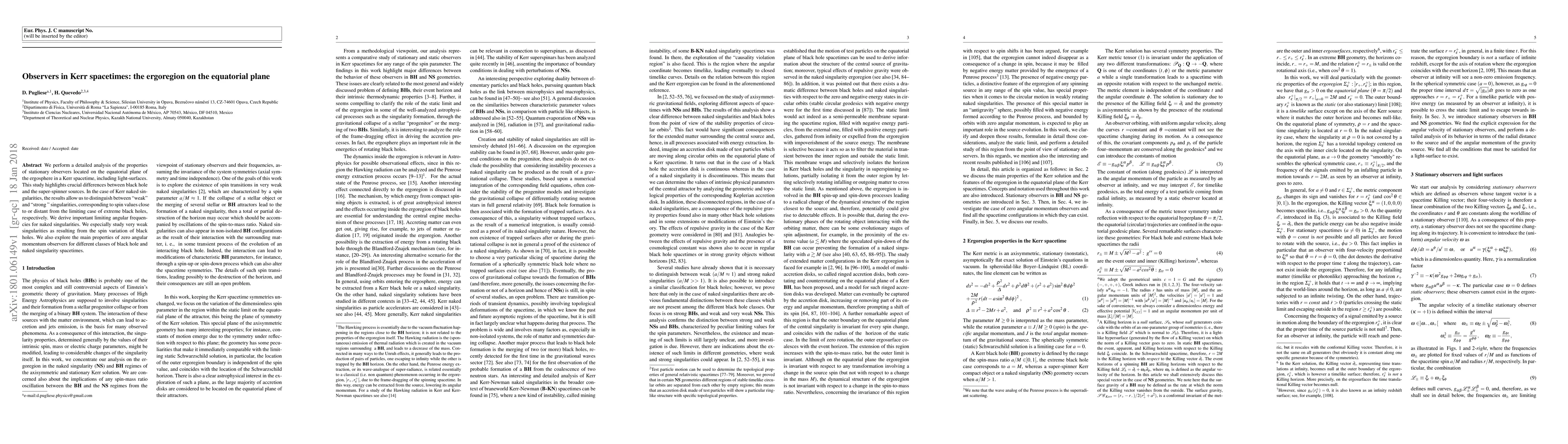 We perform a detailed analysis of the properties of stationary observers located on the equatorial plane of the ergosphere in a Kerr spacetime, including light-surfaces. This study highlights crucial differences between black hole and the super-spinner sources. In the case of Kerr naked singularities, the results allow us to distinguish between "weak" and "strong" singularities, corresponding to spin values close to or distant from the limiting case of extreme black holes, respectively. We derive important limiting angular frequencies for naked singularities. We especially study very weak singularities as resulting from the spin variation of black holes. We also explore the main properties of zero angular momentum observers for different classes of black hole and naked singularity spacetimes.