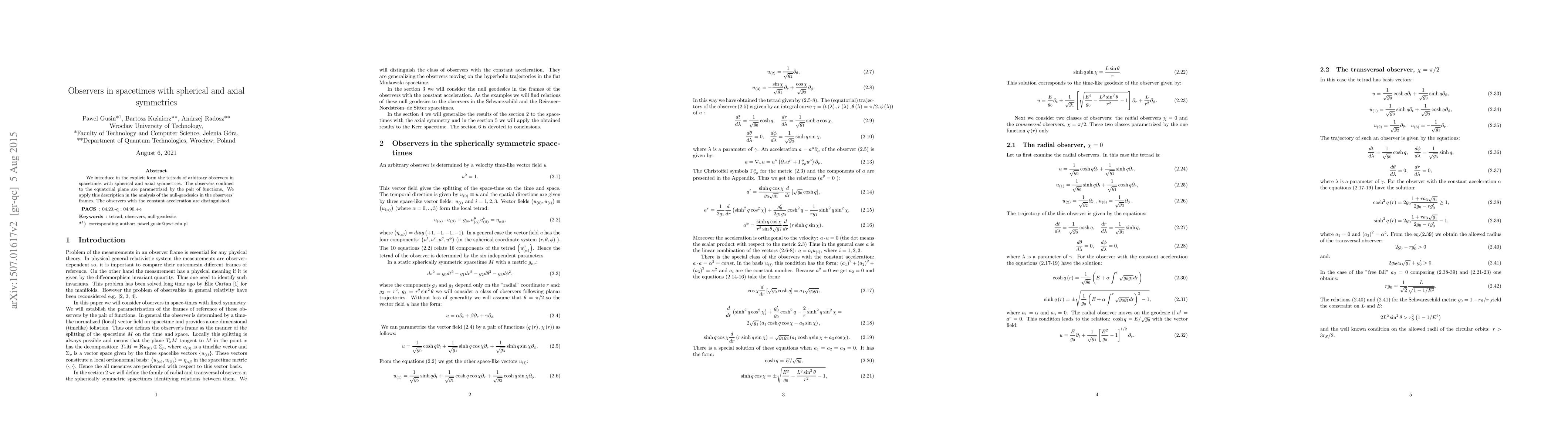 This paper presents the explicit tetrads for observers in spherically and axially symmetric spacetimes, focusing on those in the equatorial plane. It analyzes null-geodesics in these frames and highlights observers with constant acceleration.