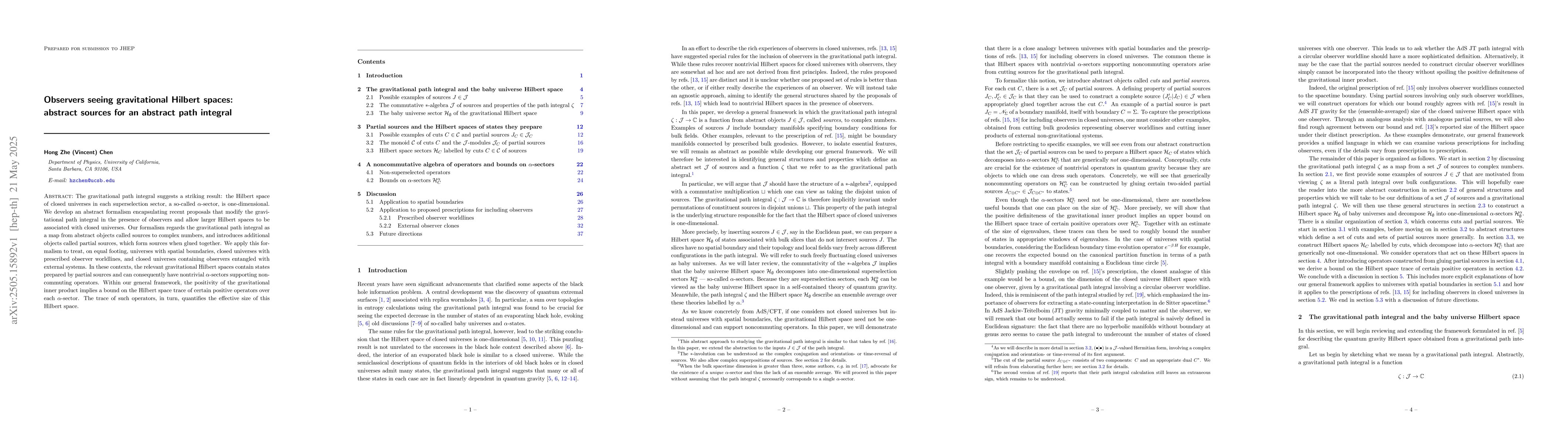 The paper develops an abstract formalism regarding the gravitational path integral, modifying it to accommodate observers and allow larger Hilbert spaces in closed universes. It introduces 'partial sources' to form 'sources' and applies this to various cosmological scenarios.