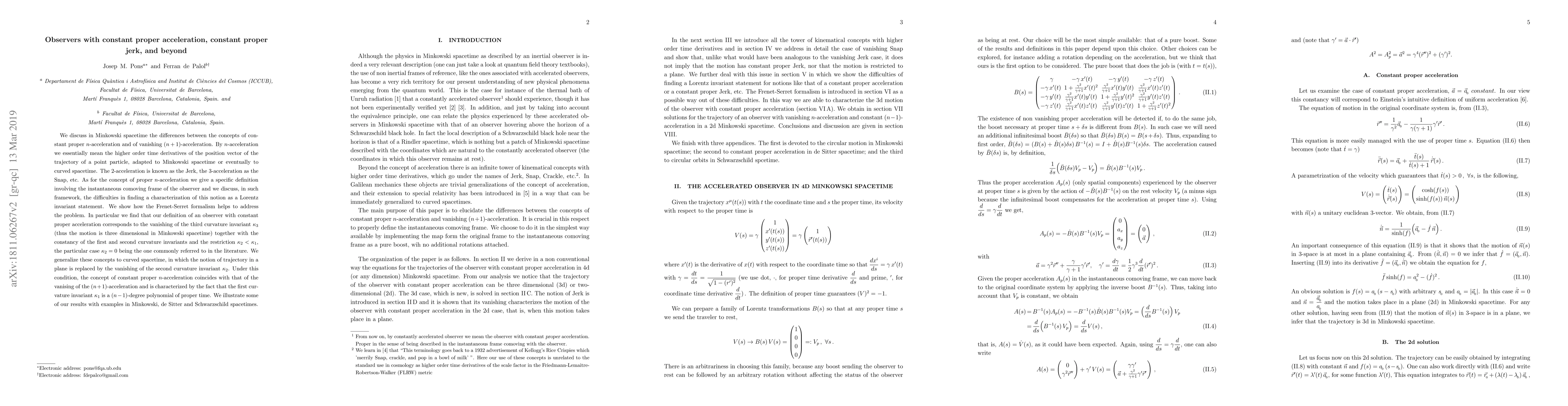 We discuss in Minkowski spacetime the differences between the concepts of constant proper $n$-acceleration and of vanishing $(n+1)$-acceleration. By $n$-acceleration we essentially mean the higher order time derivatives of the position vector of the trajectory of a point particle, adapted to Minkowski spacetime or eventually to curved spacetime. The $2$-acceleration is known as the Jerk, the $3$-acceleration as the Snap, etc. As for the concept of {\sl proper} $n$-acceleration we give a specific definition involving the instantaneous comoving frame of the observer and we discuss, in such framework, the difficulties in finding a characterization of this notion as a Lorentz invariant statement. We show how the Frenet-Serret formalism helps to address the problem. In particular we find that our definition of an observer with constant proper acceleration corresponds to the vanishing of the third curvature invariant $\kappa_3$ (thus the motion is three dimensional in Minkowski spacetime) together with the constancy of the first and second curvature invariants and the restriction $\kappa_2 < \kappa_1$, the particular case $\kappa_2=0$ being the one commonly referred to in the literature. We generalize these concepts to curved spacetime, in which the notion of trajectory in a plane is replaced by the vanishing of the second curvature invariant $\kappa_2$. Under this condition, the concept of constant proper $n$-acceleration coincides with that of the vanising of the $(n+1)$-acceleration and is characterized by the fact that the first curvature invariant $\kappa_1$ is a $(n-1)$-degree polynomial of proper time. We illustrate some of our results with examples in Minkowski, de Sitter and Schwarzschild spacetimes.