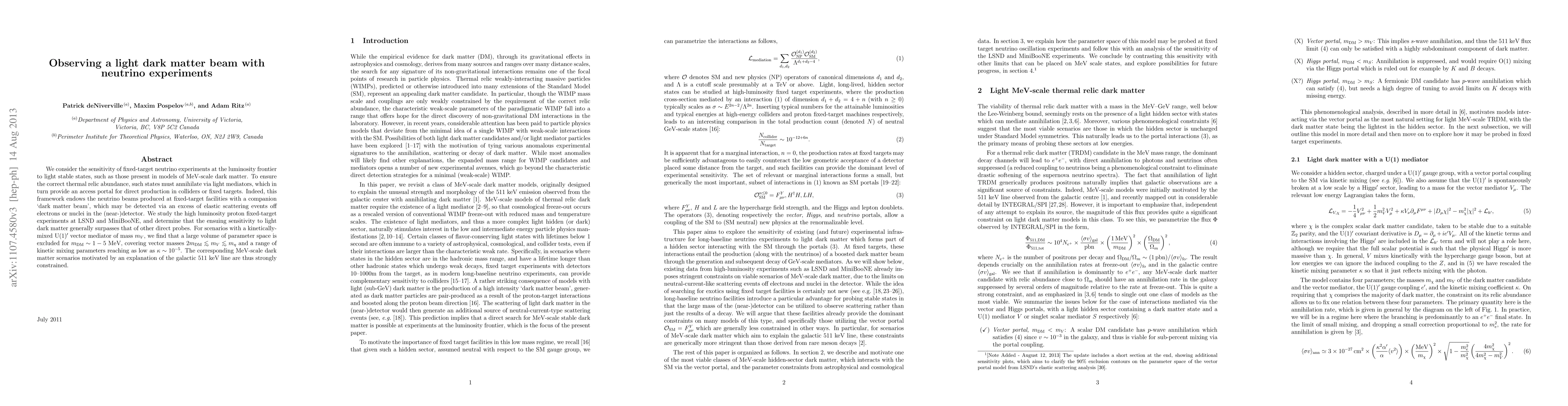 This paper investigates the potential of neutrino experiments at fixed-target facilities to detect a "dark matter beam" alongside their standard neutrino beams, finding that these experiments can surpass other direct probes in sensitivity to light dark matter. The study constrains MeV-scale dark matter scenarios, particularly those explaining the galactic 511 keV line, through kinetically-mixed U(1)' vector mediators.