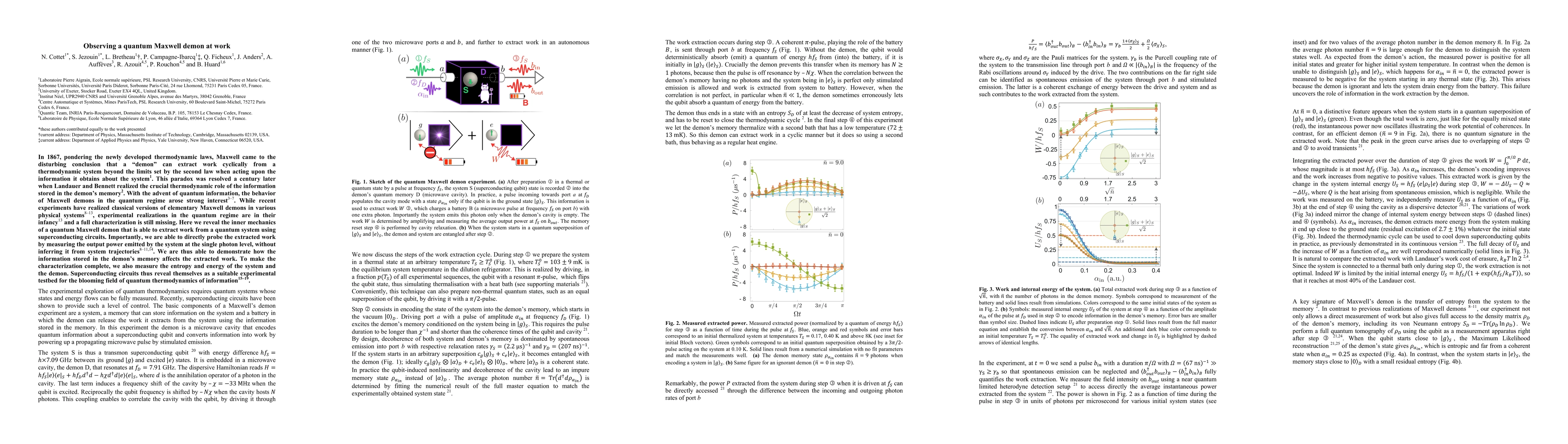 This paper demonstrates a quantum Maxwell demon experiment using a microwave cavity and superconducting qubit to extract work from a system, illustrating the interplay between quantum information and thermodynamics. The study quantifies the entropy remaining in the demon's memory, providing insight into the relationship between information and thermodynamic laws.
