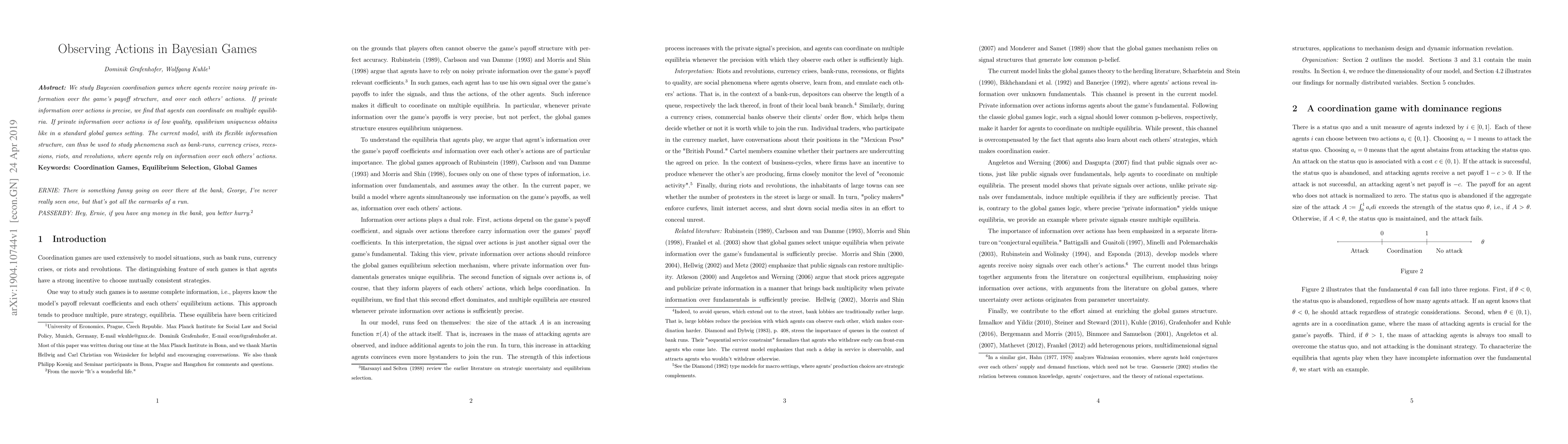 We study Bayesian coordination games where agents receive noisy private information over the game's payoff structure, and over each others' actions. If private information over actions is precise, we find that agents can coordinate on multiple equilibria. If private information over actions is of low quality, equilibrium uniqueness obtains like in a standard global games setting. The current model, with its flexible information structure, can thus be used to study phenomena such as bank-runs, currency crises, recessions, riots, and revolutions, where agents rely on information over each others' actions.
