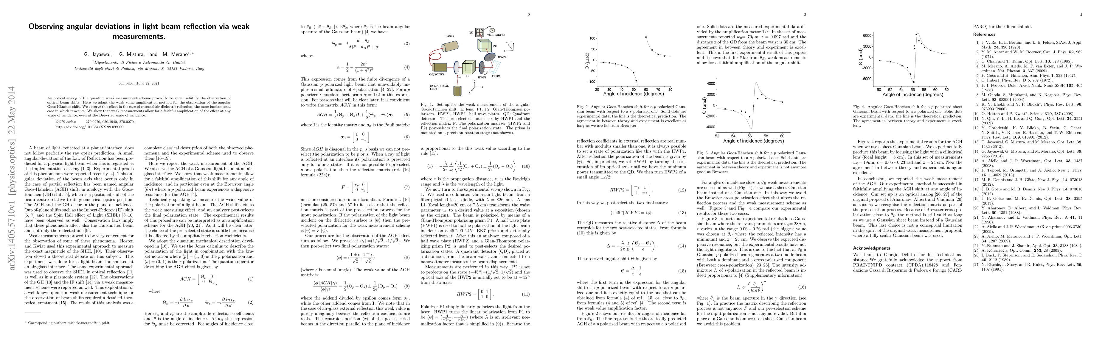 This paper demonstrates the use of weak measurement techniques to observe angular deviations in light beam reflection, specifically the Goos-Hanchen shift, through optical analogs. The method effectively amplifies the effect across various angles, including the Brewster angle, providing a more faithful observation of the shift.