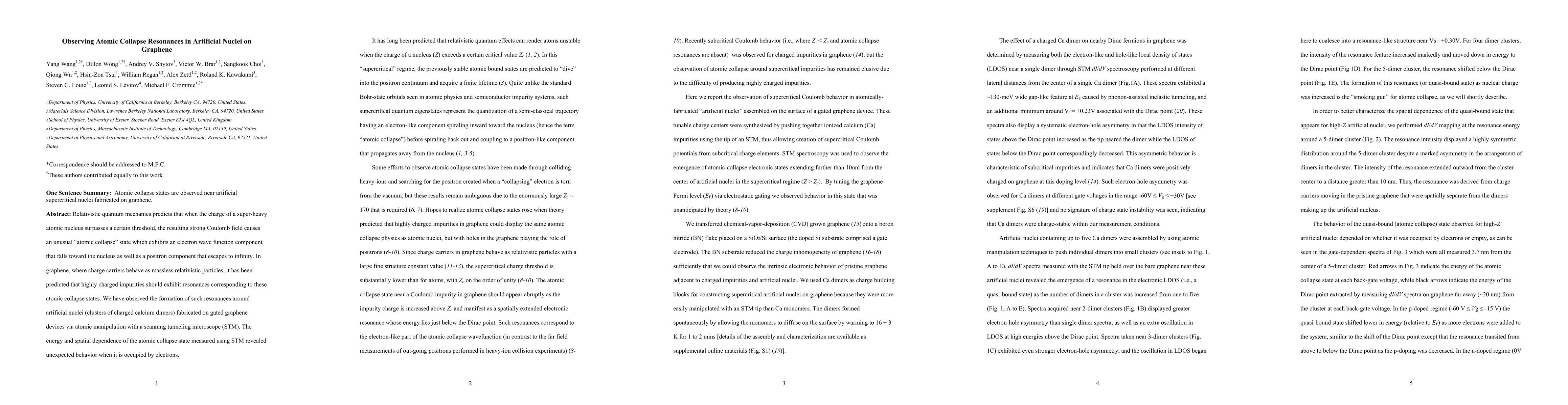 This paper reports the observation of atomic collapse resonances in artificial nuclei on graphene, predicted by relativistic quantum mechanics. Using scanning tunneling microscopy, the study reveals unexpected electron behavior in the energy and spatial dependence of these resonances around fabricated clusters of charged calcium dimers.