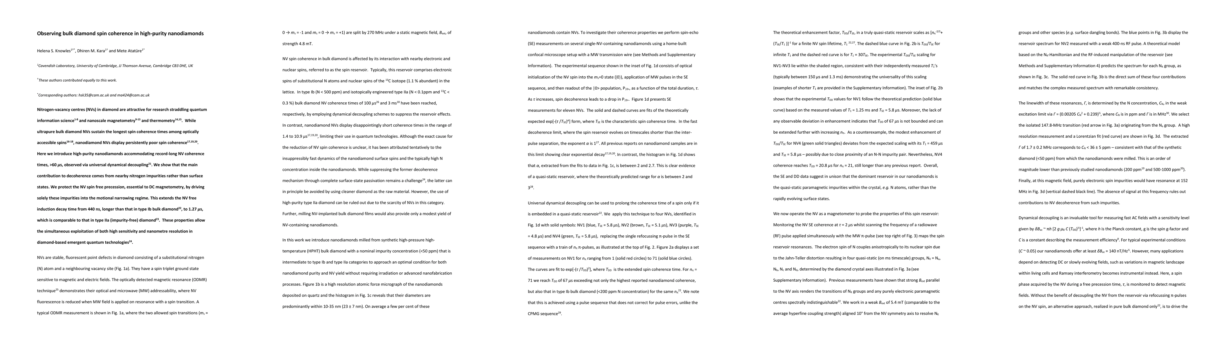This study presents high-purity nanodiamonds with NV centers that exhibit record-long spin coherence times exceeding 60 us, surpassing those in bulk diamond. The researchers attribute the improved coherence to minimizing nitrogen impurities, thus extending NV free induction decay time from 440 ns to 1.27 us, comparable to impurity-free bulk diamond.