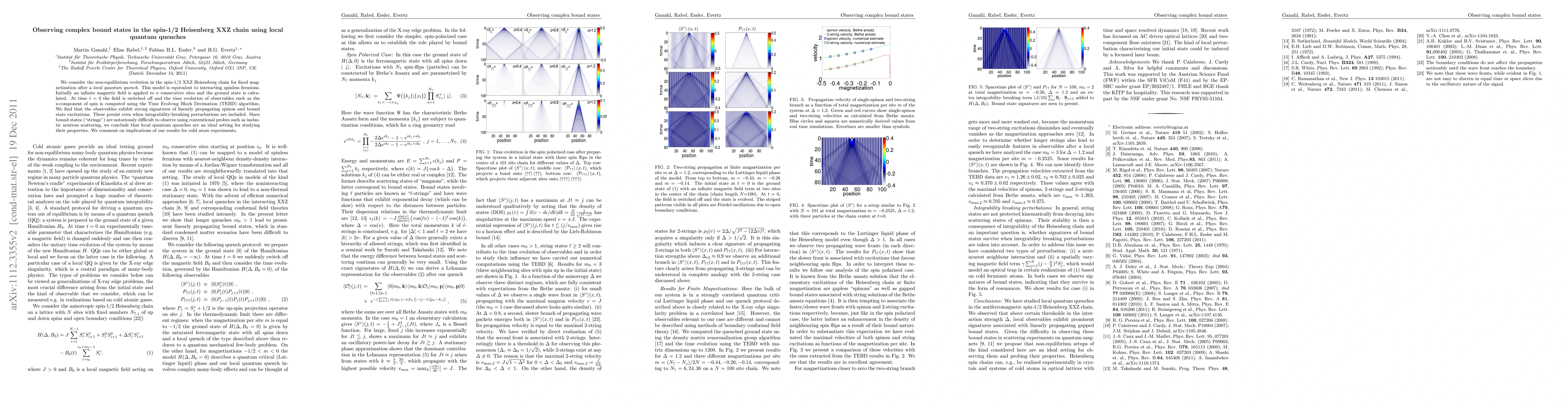 This study investigates the non-equilibrium dynamics of the spin-1/2 XXZ Heisenberg chain following a local quantum quench, revealing signatures of linearly propagating spinons and bound states using the TEBD algorithm. Local quantum quenches emerge as an effective method for observing these elusive bound states, with implications for cold atom experiments.