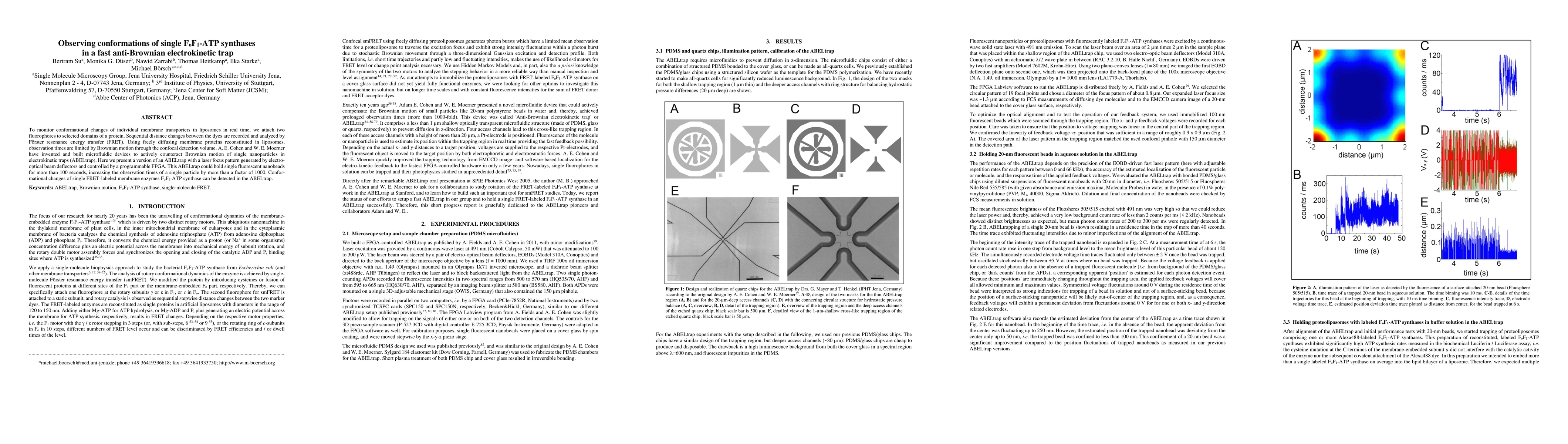 This paper describes a novel anti-Brownian electrokinetic trap (ABELtrap) for observing conformational changes in single FoF1-ATP synthases using Förster resonance energy transfer (FRET). The ABELtrap significantly enhances observation times by counteracting Brownian motion, allowing real-time monitoring of individual protein dynamics.