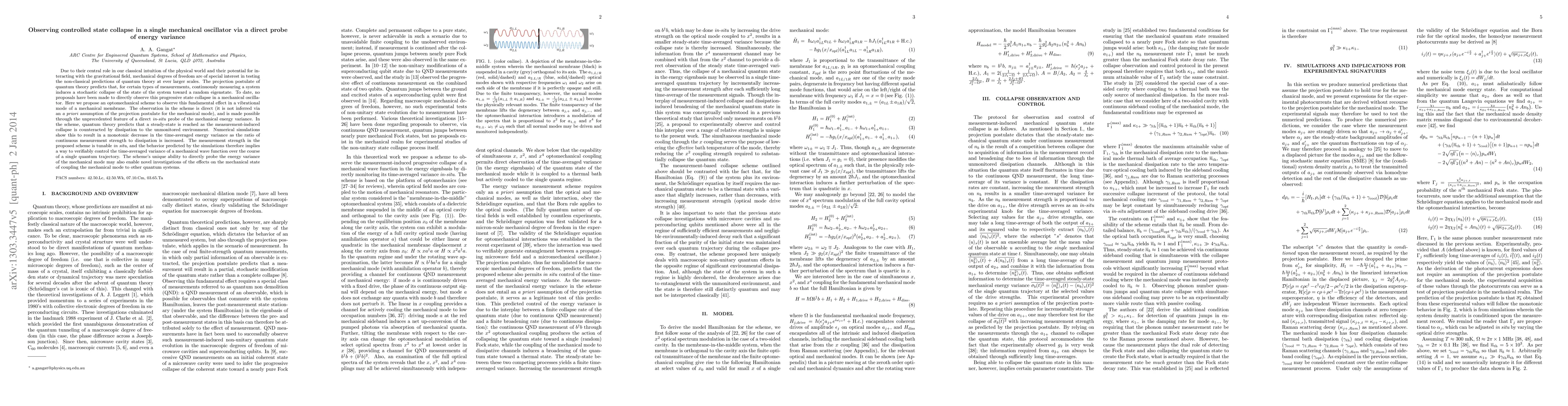 A fundamental prediction of quantum theory that is derived from the "projection postulate" is that under continuous measurement, the state of a system traces out a "quantum trajectory" in time that depends upon its measurement record, and that in certain situations, the quantum state of a system stochastically collapses at a finite rate toward a random eigenstate. On the other hand, quantum theory also predicts that environmental coupling produces the opposite effect of spreading the wave function into a mixed state. Studying the effect of these two competing processes, as the ratio of their strengths is varied, on the distribution of a quantum state is of fundamental interest in any setting, but especially so in the mechanical realm. A key issue, however, is that a fundamental study of such physics can not entail an a priori assumption of the projection postulate itself, and Bayesian inference may therefore not be employed to observe the quantum state. In this theoretical work we propose a feasible way to perform such a fundamental test with a mechanical wave function in the energy eigenbasis. The scheme is based on an optomechanical setup wherein optical fields provide a direct probe of the energy variance of the mechanical wave function. Such an energy variance probe is unprecedented in any type of system. Numerical simulations that incorporate the projection postulate predict a monotonic decrease in the time-averaged energy variance as the ratio of continuous measurement strength to dissipation is increased. The measurement strength in the proposed scheme is tunable in situ, and the behavior predicted by the simulations therefore implies that the scheme amounts to a way to verifiably control in situ the time-averaged variance of a mechanical wave function over the course of a single quantum trajectory.