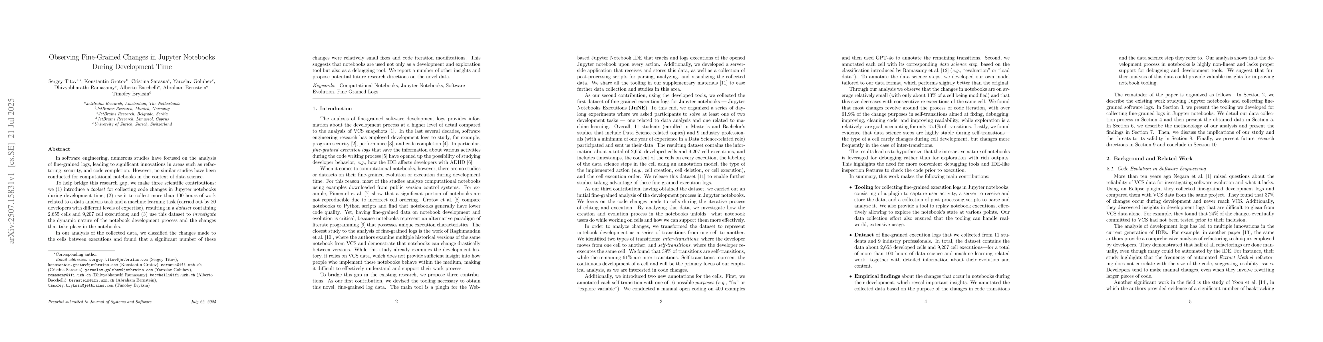 In software engineering, numerous studies have focused on the analysis of fine-grained logs, leading to significant innovations in areas such as refactoring, security, and code completion. However, no similar studies have been conducted for computational notebooks in the context of data science. To help bridge this research gap, we make three scientific contributions: we (1) introduce a toolset for collecting code changes in Jupyter notebooks during development time; (2) use it to collect more than 100 hours of work related to a data analysis task and a machine learning task (carried out by 20 developers with different levels of expertise), resulting in a dataset containing 2,655 cells and 9,207 cell executions; and (3) use this dataset to investigate the dynamic nature of the notebook development process and the changes that take place in the notebooks. In our analysis of the collected data, we classified the changes made to the cells between executions and found that a significant number of these changes were relatively small fixes and code iteration modifications. This suggests that notebooks are used not only as a development and exploration tool but also as a debugging tool. We report a number of other insights and propose potential future research directions on the novel data.