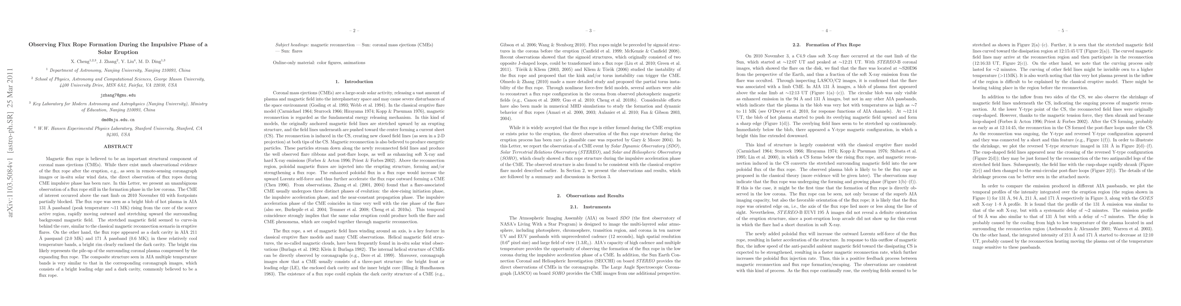 This research presents the first unambiguous observation of a magnetic flux rope in the formation phase during the impulsive phase of a solar eruption, observed as a bright blob in the low corona rising above an active region. The flux rope's structure, characterized by a bright rim enclosing a dark cavity, is consistent with the formation of coronal mass ejections and magnetic reconnection processes.