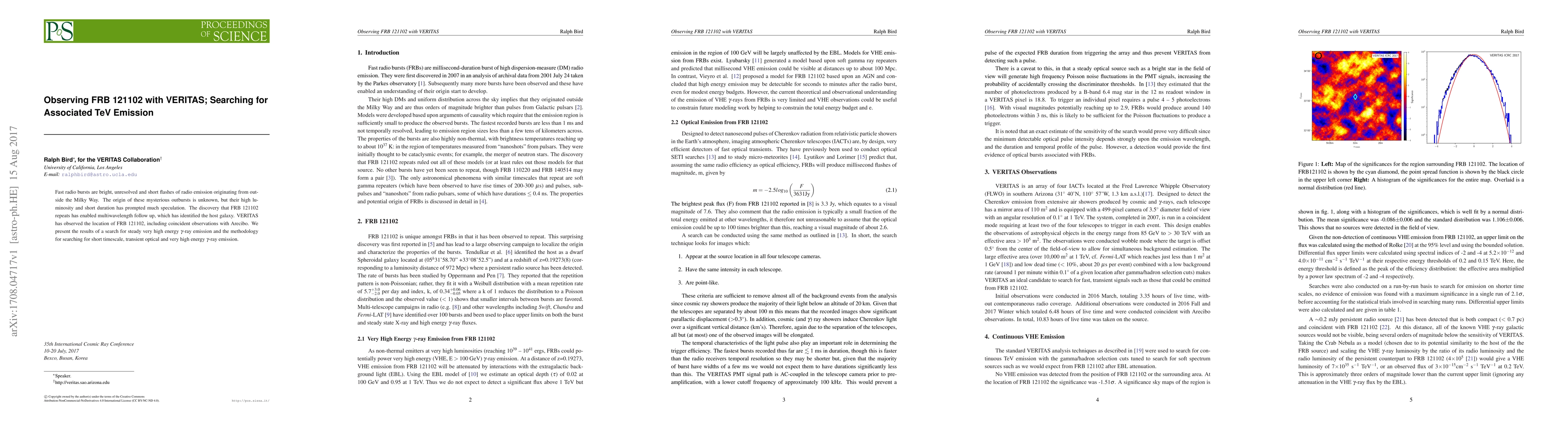 The VERITAS observatory searched for steady very high energy gamma-ray emission and short-term, transient optical/gamma-ray signals from FRB 121102, but no significant emission was detected, providing constraints on its high-energy behavior.