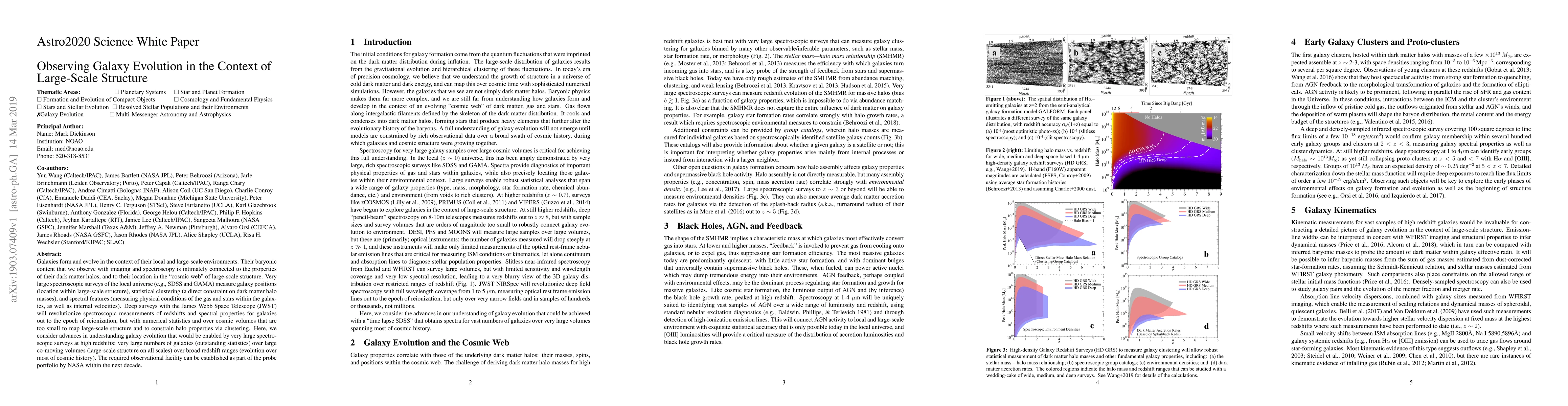 This paper discusses the potential of large spectroscopic surveys to advance our understanding of galaxy evolution by mapping galaxies' locations within large-scale structures, their dark matter halos, and internal physical conditions over vast cosmic volumes and redshift ranges. It emphasizes the need for a new observational facility to achieve these goals.