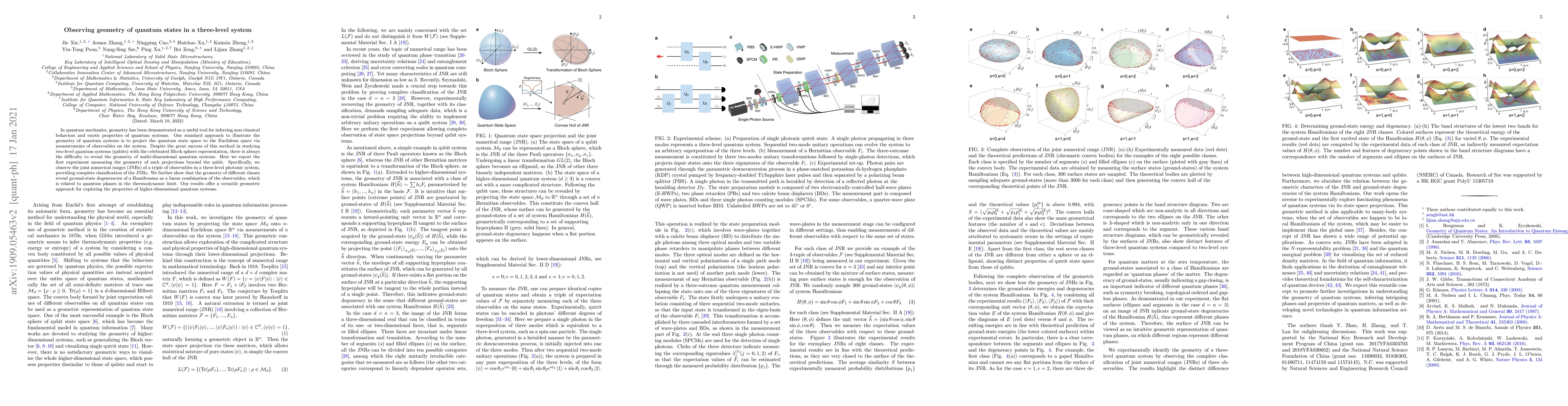 In quantum mechanics, geometry has been demonstrated as a useful tool for inferring non-classical behaviors and exotic properties of quantum systems. One standard approach to illustrate the geometry of quantum systems is to project the quantum state space to the Euclidean space via measurements of observables on the system. Despite the great success of this method in studying two-level quantum systems (qubits) with the celebrated Bloch sphere representation, there is always the difficulty to reveal the geometry of multi-dimensional quantum systems. Here we report the first experiment measuring the geometry of such projections beyond the qubit. Specifically, we observe the joint numerical ranges (JNRs) of a triple of observables in a three-level photonic system, providing complete classification of the JNRs. We further show that the geometry of different classes reveal ground-state degeneracies of a Hamiltonian as a linear combination of the observables, which is related to quantum phases in the thermodynamic limit. Our results offer a versatile geometric approach for exploring the properties of higher-dimensional quantum systems.