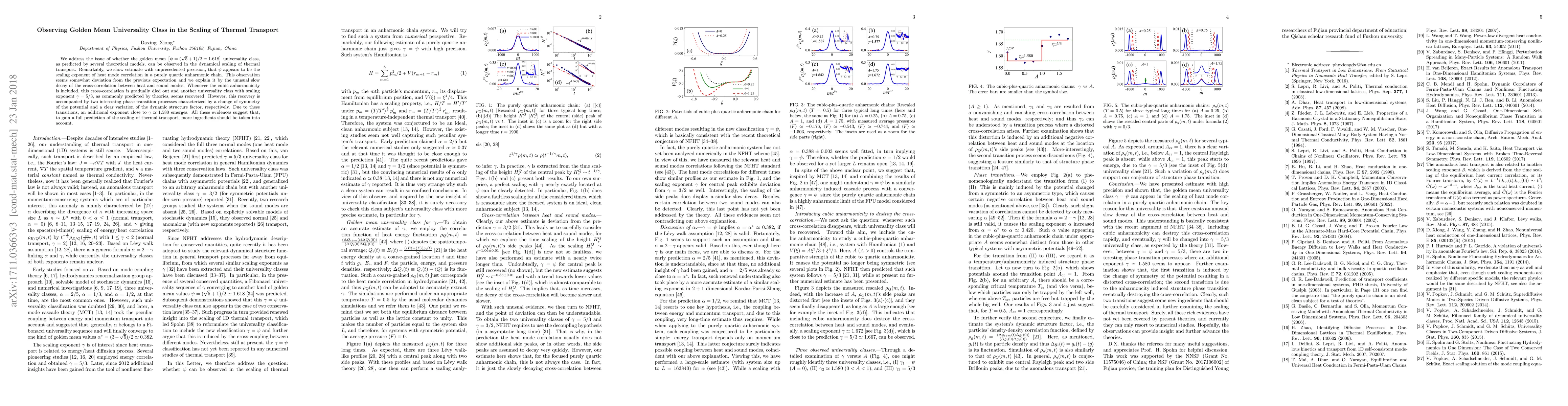 We address the issue of whether the golden mean $\left[\psi=(\sqrt{5}+1)/2 \simeq 1.618\right]$ universality class, as predicted by several theoretical models, can be observed in the dynamical scaling of thermal transport. Remarkably, we show estimate with unprecedented precision, that $\psi$ appears to be the scaling exponent of heat mode correlation in a purely quartic anharmonic chain. This observation seems somewhat deviation from the previous expectation and we explain it by the unusual slow decay of the cross-correlation between heat and sound modes. Whenever the cubic anharmonicity is included, this cross-correlation is gradually died out and another universality class with scaling exponent $\gamma=5/3$, as commonly predicted by theories, seems recovered. However, this recovery is accompanied by two interesting phase transition processes characterized by a change of symmetry of the potential and a clear variation of the dynamic structure factor, respectively. Due to these transitions, an additional exponent close to $\gamma \simeq 1.580$ emerges. All these evidences suggest that, to gain a full prediction of the scaling of thermal transport, more ingredients should be taken into account.