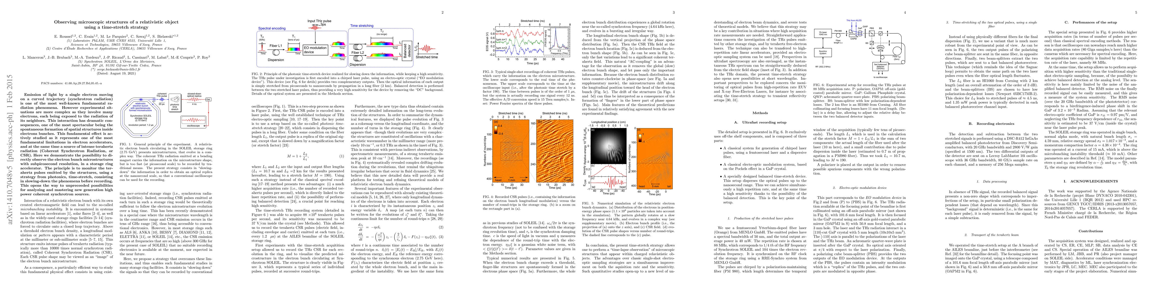 Emission of light by a single electron moving on a curved trajectory (synchrotron radiation) is one of the most well-known fundamental radiation phenomena. However experimental situations are more complex as they involve many electrons, each being exposed to the radiation of its neighbors. This interaction has dramatic consequences, one of the most spectacular being the spontaneous formation of spatial structures inside electrons bunches. This fundamental effect is actively studied as it represents one of the most fundamental limitations in electron accelerators, and at the same time a source of intense terahertz radiation (Coherent Synchrotron Radiation, or CSR). Here we demonstrate the possibility to directly observe the electron bunch microstructures with subpicosecond resolution, in a storage ring accelerator. The principle is to monitor the terahertz pulses emitted by the structures, using a strategy from photonics, time-stretch, consisting in slowing-down the phenomena before recording. This opens the way to unpreceeded possibilities for analyzing and mastering new generation high power coherent synchrotron sources.