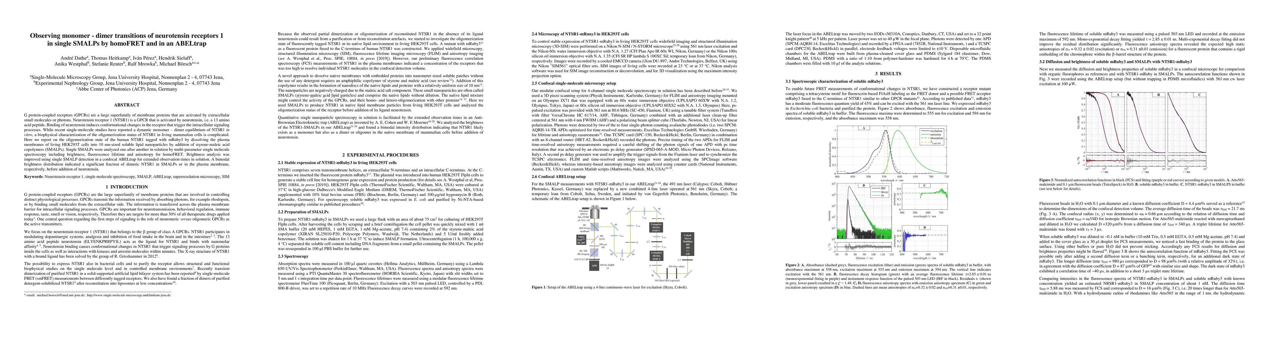 This paper investigates the monomer-dimer transitions of neurotensin receptor 1 (NTSR1) using homoFRET and single SMALP analysis. It finds a significant fraction of dimeric NTSR1 in living HEK293T cells, as indicated by a bimodal brightness distribution in single-molecule spectroscopy.