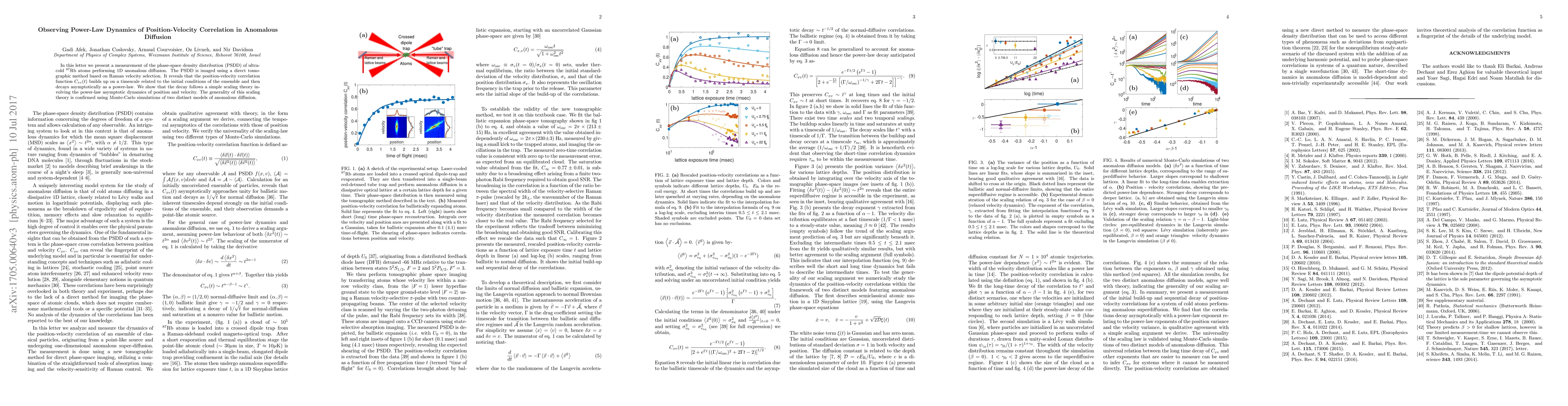 This paper measures the phase-space density distribution of ultra-cold \Rb atoms undergoing 1D anomalous diffusion, revealing a power-law decay in the position-velocity correlation function. The findings support a scaling theory for the observed dynamics, validated through Monte-Carlo simulations of different anomalous diffusion models.