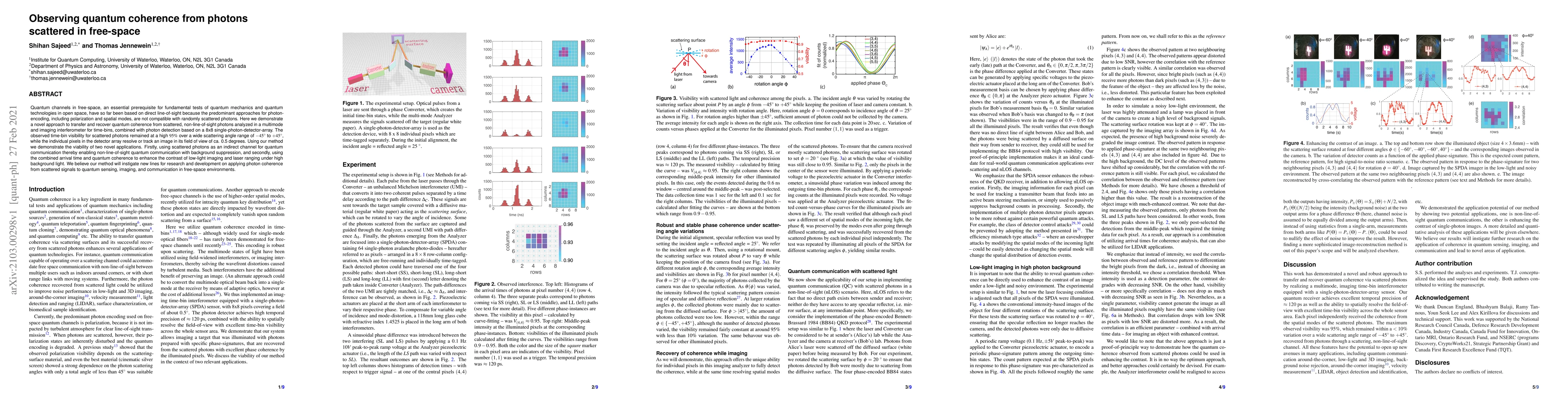 Quantum channels in free-space, an essential prerequisite for fundamental tests of quantum mechanics and quantum technologies in open space, have so far been based on direct line-of-sight because the predominant approaches for photon-encoding, including polarization and spatial modes, are not compatible with randomly scattered photons. Here we demonstrate a novel approach to transfer and recover quantum coherence from scattered, non-line-of-sight photons analyzed in a multimode and imaging interferometer for time-bins, combined with photon detection based on a 8x8 single-photon-detector-array. The observed time-bin visibility for scattered photons remained at a high $95\%$ over a wide scattering angle range of -45 degree to +45 degree, while the individual pixels in the detector array resolve or track an image in its field of view of ca. 0.5 degrees. Using our method we demonstrate the viability of two novel applications. Firstly, using scattered photons as an indirect channel for quantum communication thereby enabling non-line-of-sight quantum communication with background suppression, and secondly, using the combined arrival time and quantum coherence to enhance the contrast of low-light imaging and laser ranging under high background light. We believe our method will instigate new lines for research and development on applying photon coherence from scattered signals to quantum sensing, imaging, and communication in free-space environments.
