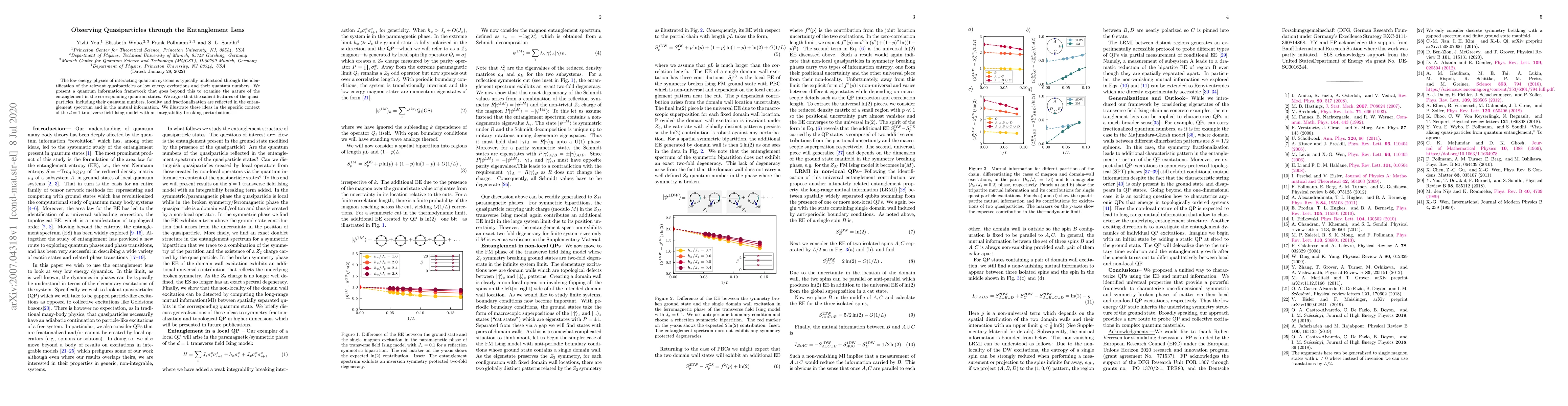 The low energy physics of interacting quantum systems is typically understood through the identification of the relevant quasiparticles or low energy excitations and their quantum numbers. We present a quantum information framework that goes beyond this to examine the nature of the entanglement in the corresponding quantum states. We argue that the salient features of the quasiparticles, including their quantum numbers, locality and fractionalization are reflected in the entanglement spectrum and in the mutual information. We illustrate these ideas in the specific context of the $d=1$ transverse field Ising model with an integrability breaking perturbation.