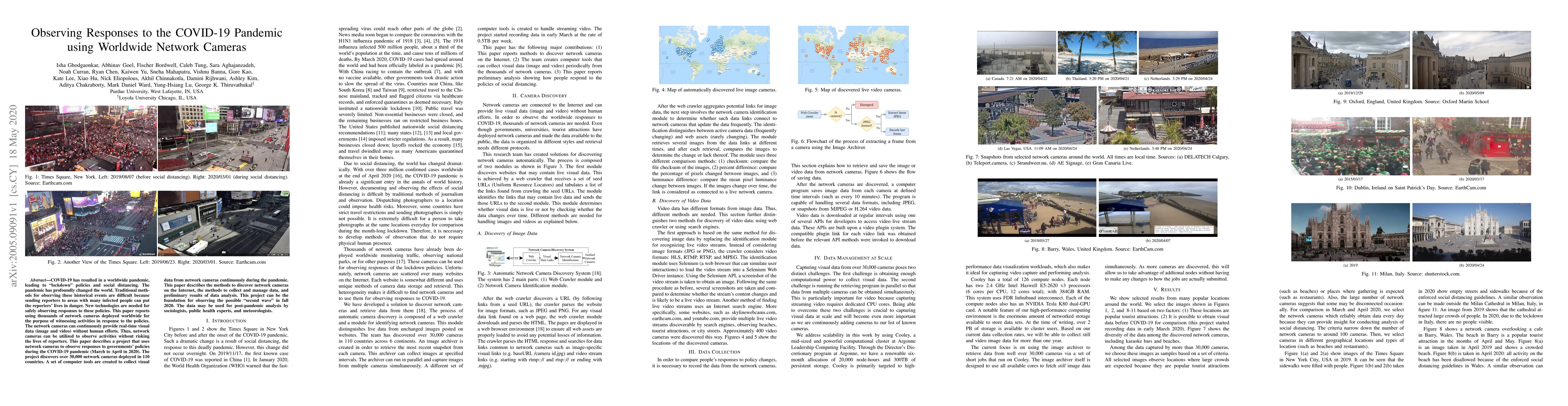 This paper explores the use of worldwide network cameras to observe responses to COVID-19 lockdown policies, providing real-time visual data without risking reporters' lives. The project identified over 30,000 cameras in 110 countries and developed tools for continuous data collection and analysis, laying the groundwork for future pandemic monitoring.