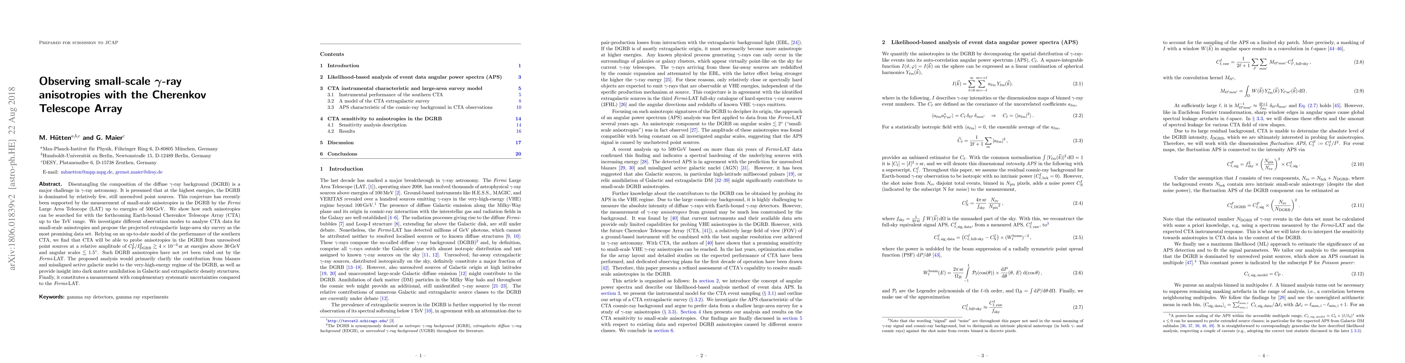 This paper discusses the potential of the Cherenkov Telescope Array (CTA) to detect small-scale anisotropies in the diffuse gamma-ray background (DGRB) up to the TeV range, focusing on unresolved point sources. It proposes that CTA's extragalactic large-area sky survey will enable the detection of anisotropies at a relative amplitude of $C_{\rm P}^I/I^2_{\rm DGRB}\gtrsim 4\times 10^{-3}\,{\rm sr}$ at energies above 30 GeV, providing insights into blazars, misaligned active galactic nuclei, and dark matter annihilation.