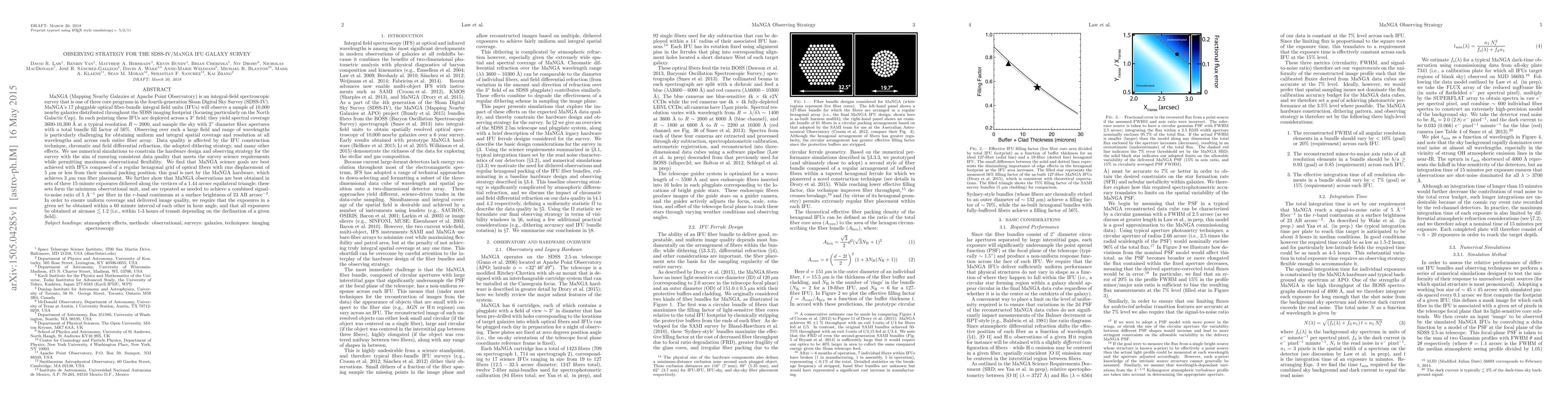 The MaNGA survey employs integral-field spectroscopy to observe 10,000 nearby galaxies, facing challenges in achieving uniform coverage and resolution. The optimal observing strategy involves using three 15-minute dithered exposures per set to meet science goals and ensure consistent data quality.