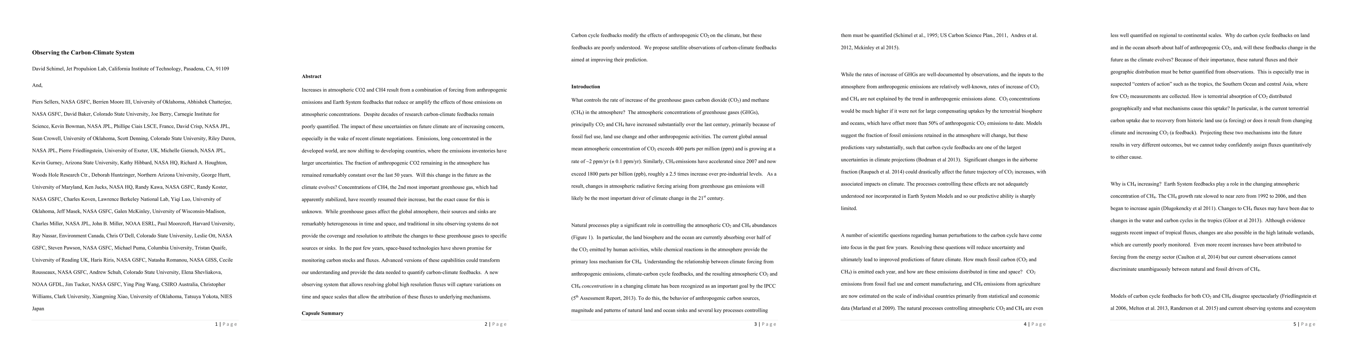 Increases in atmospheric CO2 and CH4 result from a combination of forcing from anthropogenic emissions and Earth System feedbacks that reduce or amplify the effects of those emissions on atmospheric concentrations. Despite decades of research carbon-climate feedbacks remain poorly quantified. The impact of these uncertainties on future climate are of increasing concern, especially in the wake of recent climate negotiations. Emissions, long concentrated in the developed world, are now shifting to developing countries, where the emissions inventories have larger uncertainties. The fraction of anthropogenic CO2 remaining in the atmosphere has remained remarkably constant over the last 50 years. Will this change in the future as the climate evolves? Concentrations of CH4, the 2nd most important greenhouse gas, which had apparently stabilized, have recently resumed their increase, but the exact cause for this is unknown. While greenhouse gases affect the global atmosphere, their sources and sinks are remarkably heterogeneous in time and space, and traditional in situ observing systems do not provide the coverage and resolution to attribute the changes to these greenhouse gases to specific sources or sinks. In the past few years, space-based technologies have shown promise for monitoring carbon stocks and fluxes. Advanced versions of these capabilities could transform our understanding and provide the data needed to quantify carbon-climate feedbacks. A new observing system that allows resolving global high resolution fluxes will capture variations on time and space scales that allow the attribution of these fluxes to underlying mechanisms.