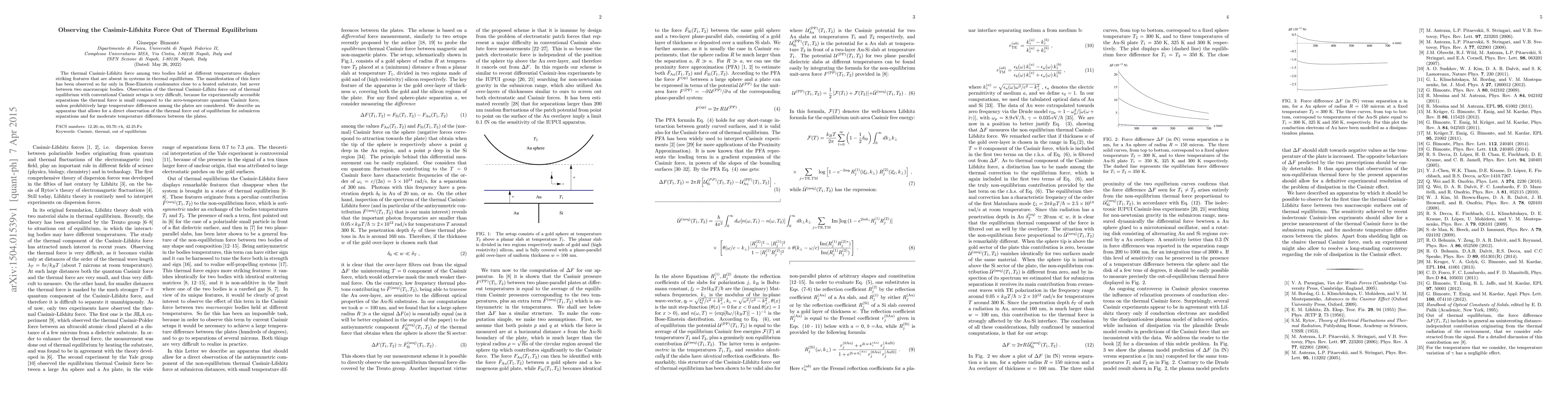 The thermal Casimir-Lifshitz force among two bodies held at different temperatures displays striking features that are absent in systems in thermal equilibrium. The manifestation of this force has been observed so far only in Bose-Einstein condensates close to a heated substrate, but never between two macroscopic bodies. Observation of the thermal Casimir-Lifhitz force out of thermal equilibrium with conventional Casimir setups is very difficult, because for experimentally accessible separations the thermal force is small compared to the zero-temperature quantum Casimir force, unless prohibitively large temperature differences among the plates are considered. We describe an apparatus that allows for a direct observation of the thermal force out of equilibrium for submicron separations and for moderate temperature differences between the plates.