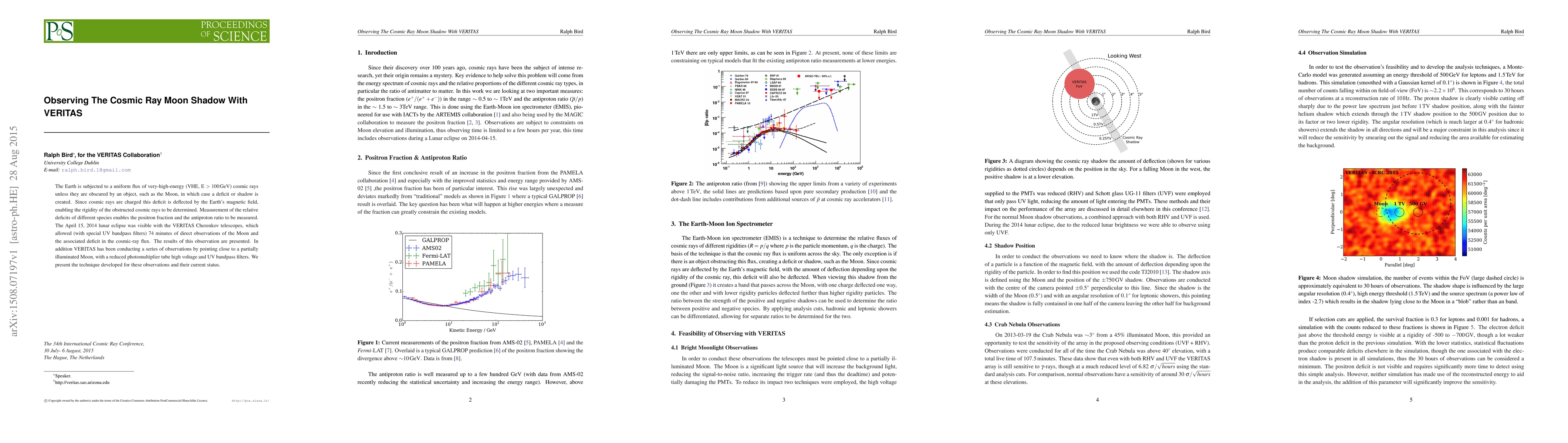 The VERITAS Cherenkov telescopes observed the cosmic ray moon shadow during the April 15, 2014 lunar eclipse, providing data on the cosmic-ray flux deficit and enabling measurements of the positron fraction and antiproton ratio. VERITAS also developed a technique for observing partially illuminated Moon conditions to further study these cosmic ray effects.