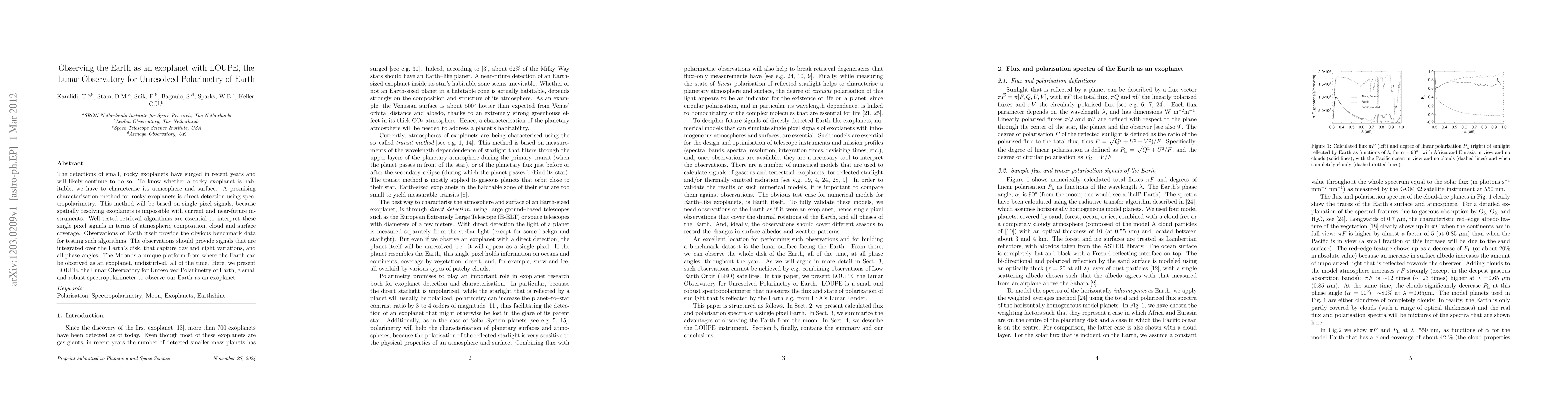 The detections of small, rocky exoplanets have surged in recent years and will likely continue to do so. To know whether a rocky exoplanet is habitable, we have to characterise its atmosphere and surface. A promising characterisation method for rocky exoplanets is direct detection using spectropolarimetry. This method will be based on single pixel signals, because spatially resolving exoplanets is impossible with current and near-future instruments. Well-tested retrieval algorithms are essential to interpret these single pixel signals in terms of atmospheric composition, cloud and surface coverage. Observations of Earth itself provide the obvious benchmark data for testing such algorithms. The observations should provide signals that are integrated over the Earth's disk, that capture day and night variations, and all phase angles. The Moon is a unique platform from where the Earth can be observed as an exoplanet, undisturbed, all of the time. Here, we present LOUPE, the Lunar Observatory for Unresolved Polarimetry of Earth, a small and robust spectropolarimeter to observe our Earth as an exoplanet.