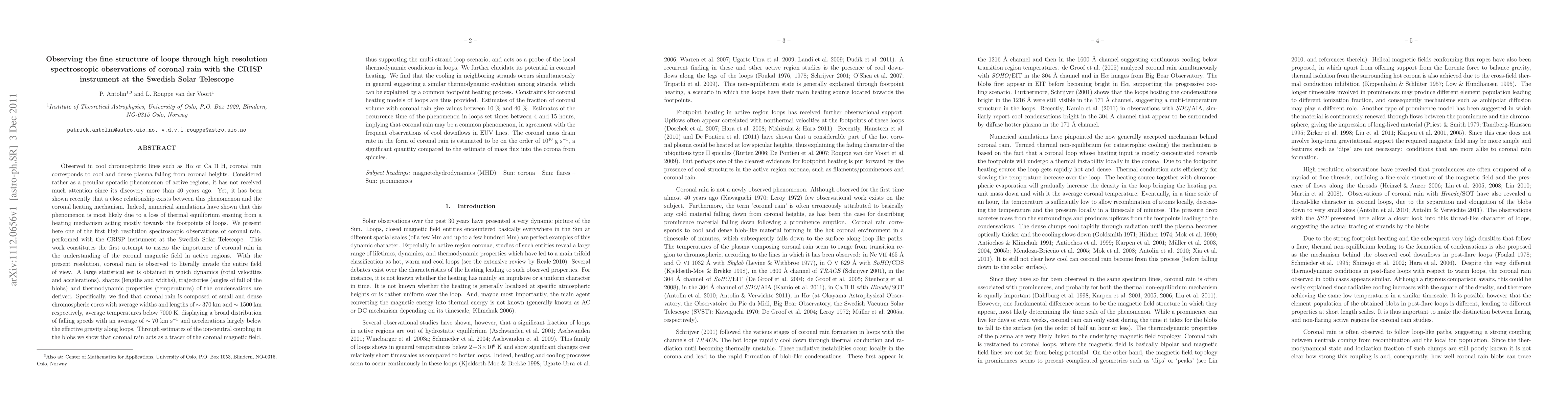 This study uses high-resolution spectroscopy from the CRISP instrument at the Swedish Solar Telescope to observe coronal rain, revealing small, dense chromospheric cores, and providing insights into the coronal magnetic field and thermodynamic conditions in active regions. The findings suggest coronal rain acts as a tracer for the magnetic field and supports the multi-strand loop scenario.