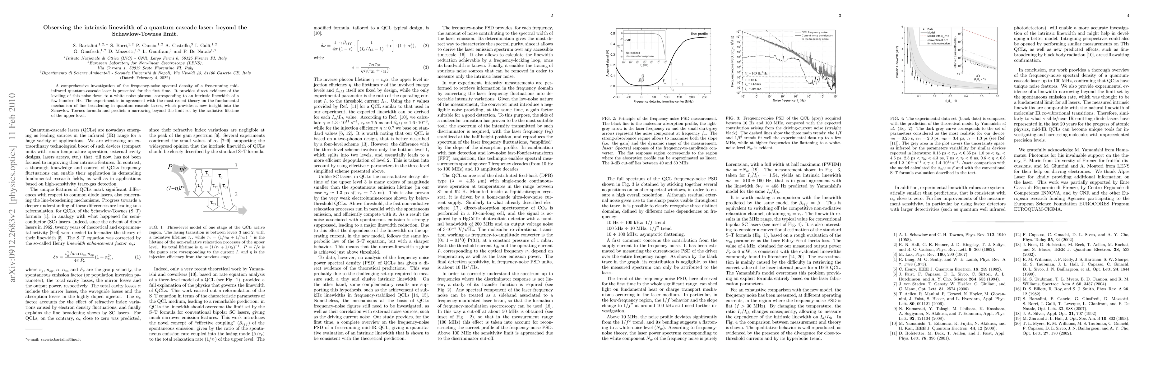 This paper investigates the frequency-noise spectral density of a mid-infrared quantum-cascade laser, revealing an intrinsic linewidth of a few hundred Hz, which confirms recent theoretical predictions of line broadening mechanisms beyond the Schawlow-Townes limit. The findings provide new insights into fundamental laser dynamics.