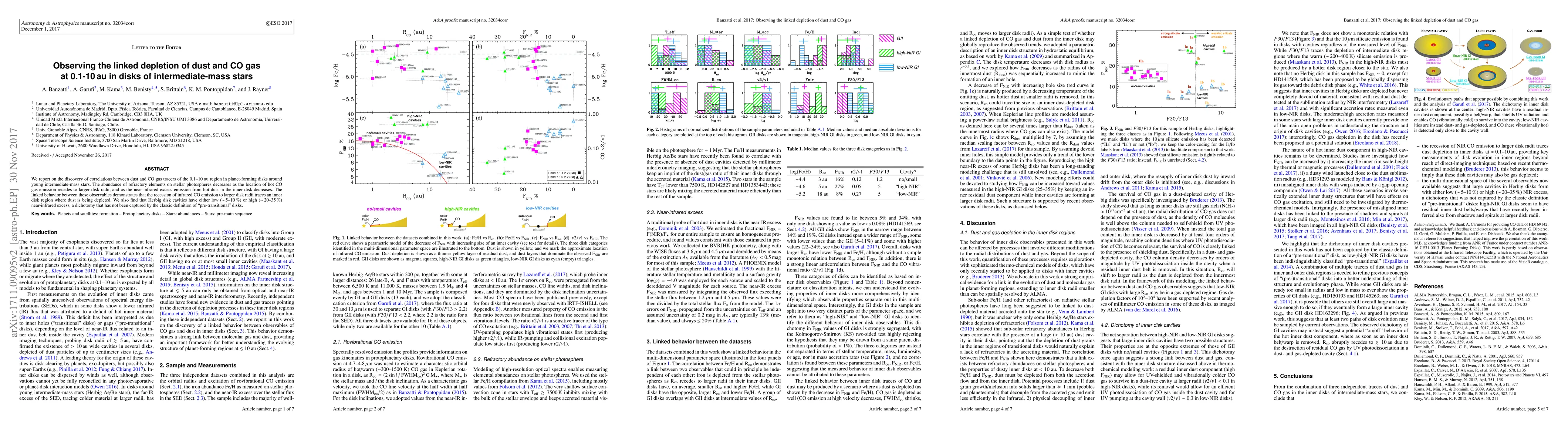 This study reveals correlations between dust and CO gas in planet-forming disks around intermediate-mass stars, showing that dust depletion correlates with the recession of CO gas to larger radii. The findings suggest a link between the inner disk region's CO emission and dust depletion, and highlight a dichotomy in near-infrared excess emissions in Herbig disks.