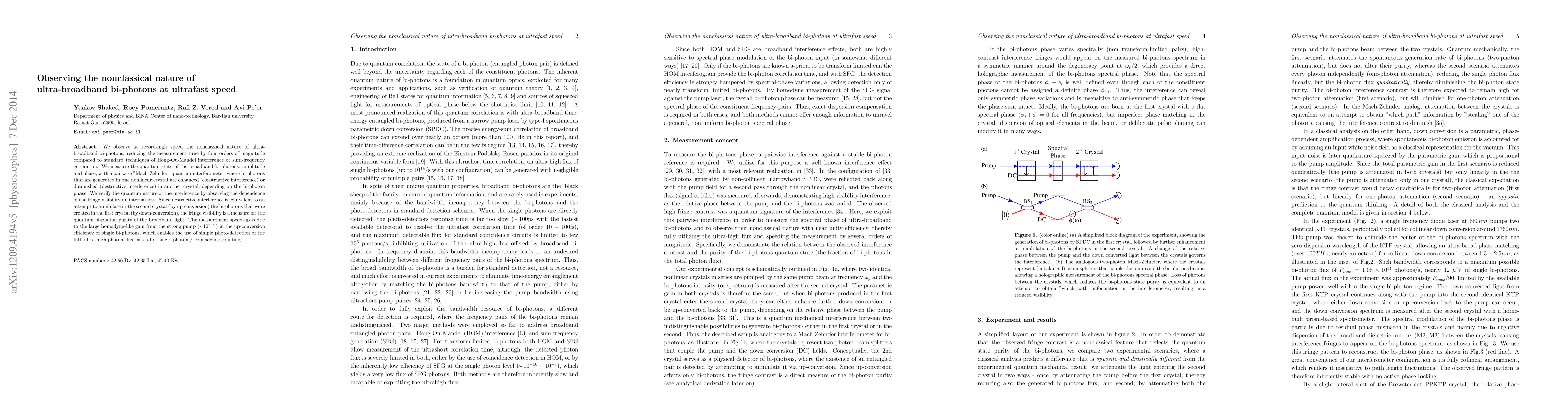 This paper reports a record-high speed observation of the nonclassical nature of ultra-broadband bi-photons, achieving a four-order-of-magnitude reduction in measurement time compared to traditional methods. The quantum state is measured using a "Mach-Zehnder" quantum interferometer, demonstrating quantum interference and bi-photon purity through fringe visibility.