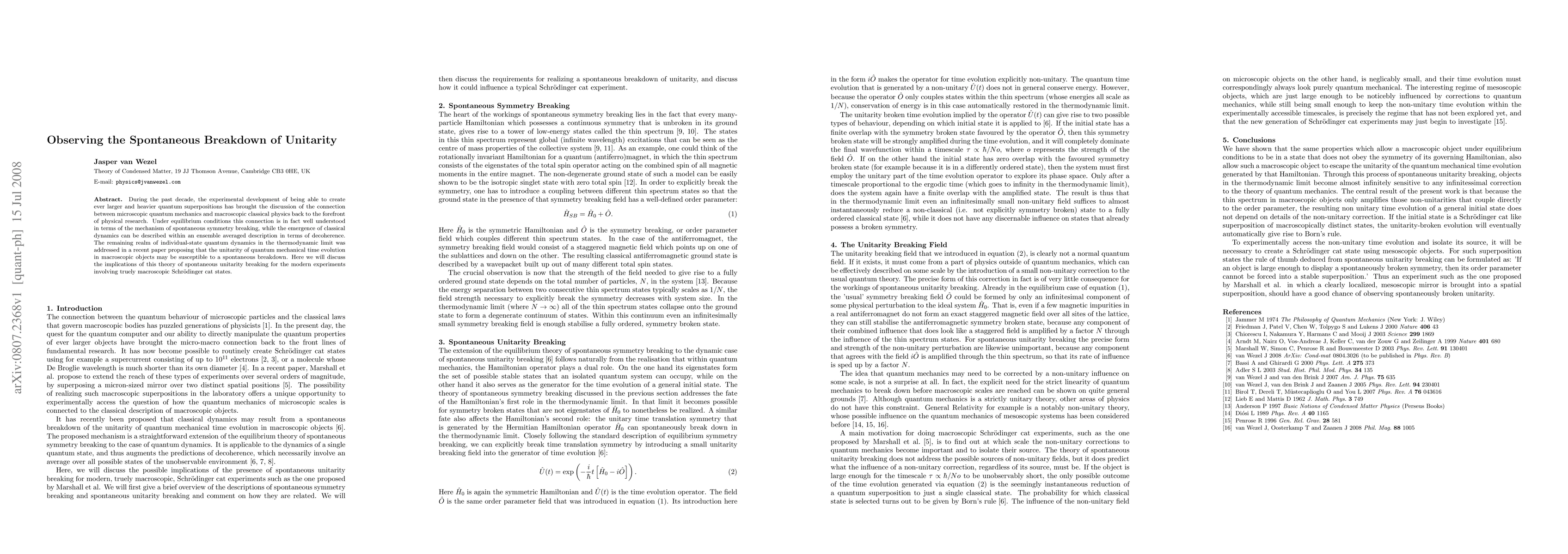 This paper explores the theoretical implications of spontaneous unitarity breaking in quantum mechanics, suggesting that macroscopic quantum superpositions may not strictly adhere to unitary evolution. It discusses how this phenomenon could impact modern experiments with large-scale Schrödinger cat states.