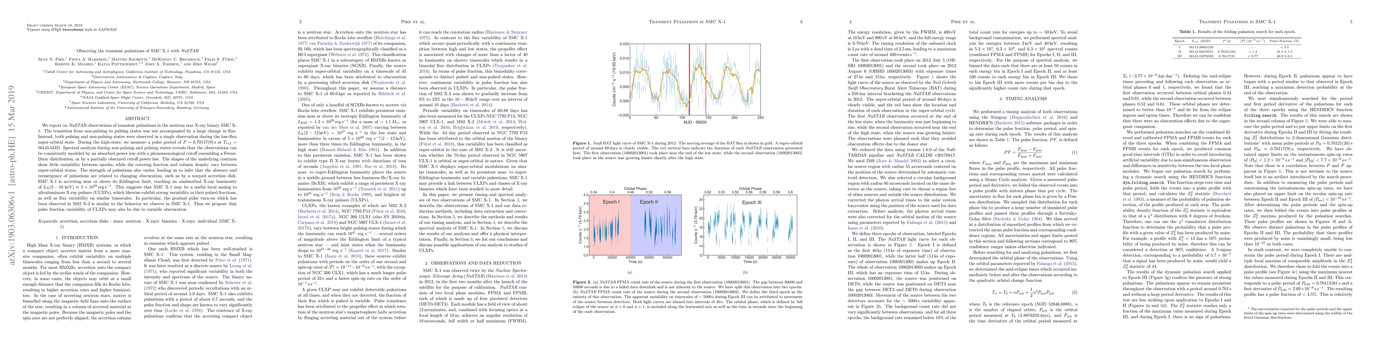 This study uses NuSTAR to observe transient pulsations in SMC X-1, finding that the transition between pulsing and non-pulsing states occurs without significant flux changes. The pulse period is measured at 0.70117 s, and spectral analysis suggests variability in covering fraction and column density, indicating that changes in obscuration, possibly due to a warped accretion disk, influence the pulsations.