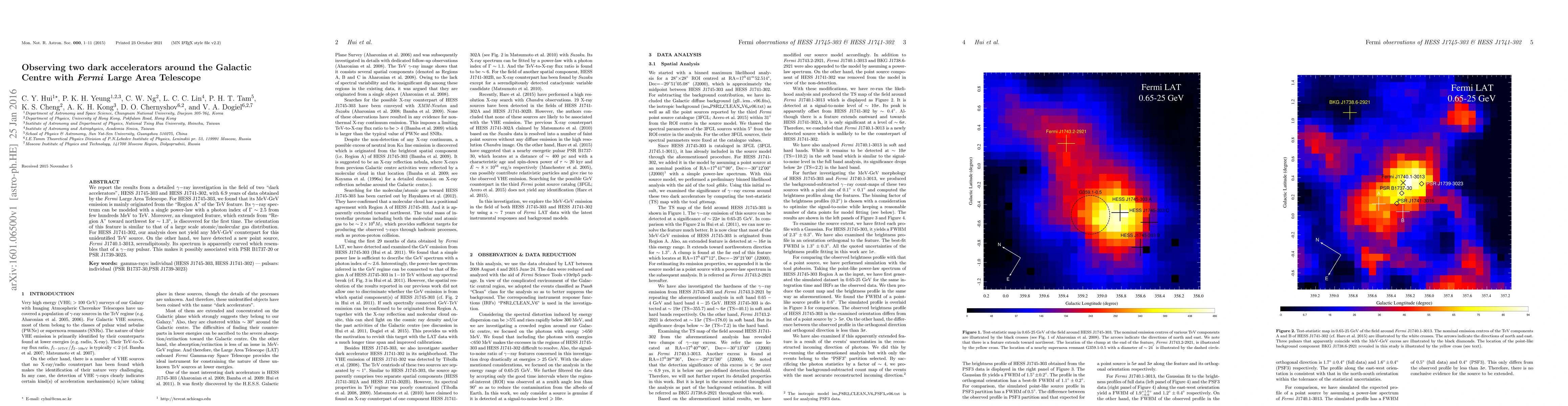 We report the results from a detailed $\gamma-$ray investigation in the field of two "dark accelerators", HESS J1745-303 and HESS J1741-302, with $6.9$ years of data obtained by the Fermi Large Area Telescope. For HESS J1745-303, we found that its MeV-GeV emission is mainly originated from the "Region A" of the TeV feature. Its $\gamma-$ray spectrum can be modeled with a single power-law with a photon index of $\Gamma\sim2.5$ from few hundreds MeV to TeV. Moreover, an elongated feature, which extends from "Region A" toward northwest for $\sim1.3^{\circ}$, is discovered for the first time. The orientation of this feature is similar to that of a large scale atomic/molecular gas distribution. For HESS J1741-302, our analysis does not yield any MeV-GeV counterpart for this unidentified TeV source. On the other hand, we have detected a new point source, Fermi J1740.1-3013, serendipitously. Its spectrum is apparently curved which resembles that of a $\gamma-$ray pulsar. This makes it possibly associated with PSR B1737-20 or PSR J1739-3023.