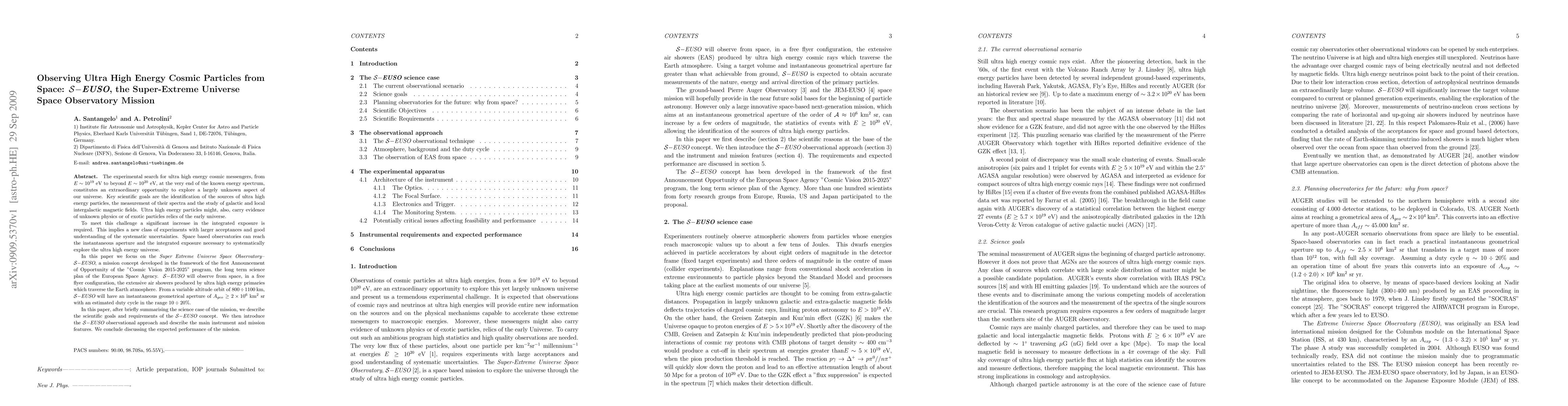 The SEUSO mission aims to explore ultra-high energy cosmic particles from space, with a focus on identifying sources, measuring spectra, and studying magnetic fields. By increasing exposure and understanding systematic uncertainties, the mission seeks to uncover evidence of unknown physics or exotic particle relics.