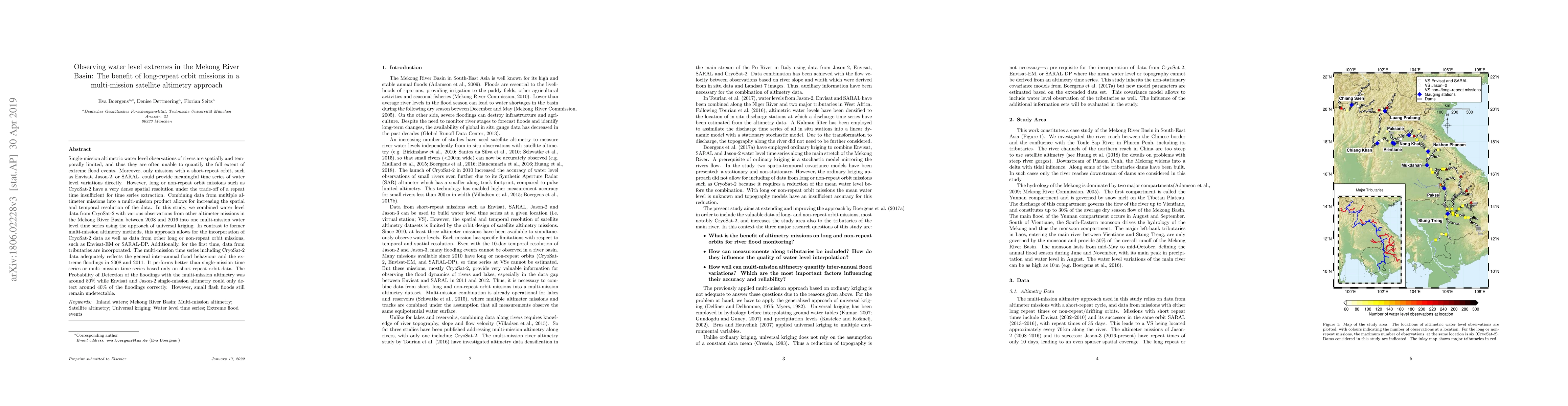 This study combines satellite altimetry data from multiple missions, including CryoSat-2, to create a multi-mission water level time series for the Mekong River Basin. The approach of universal kriging effectively integrates data from long and non-repeat orbit missions, improving the detection of extreme floods compared to single-mission altimetry.