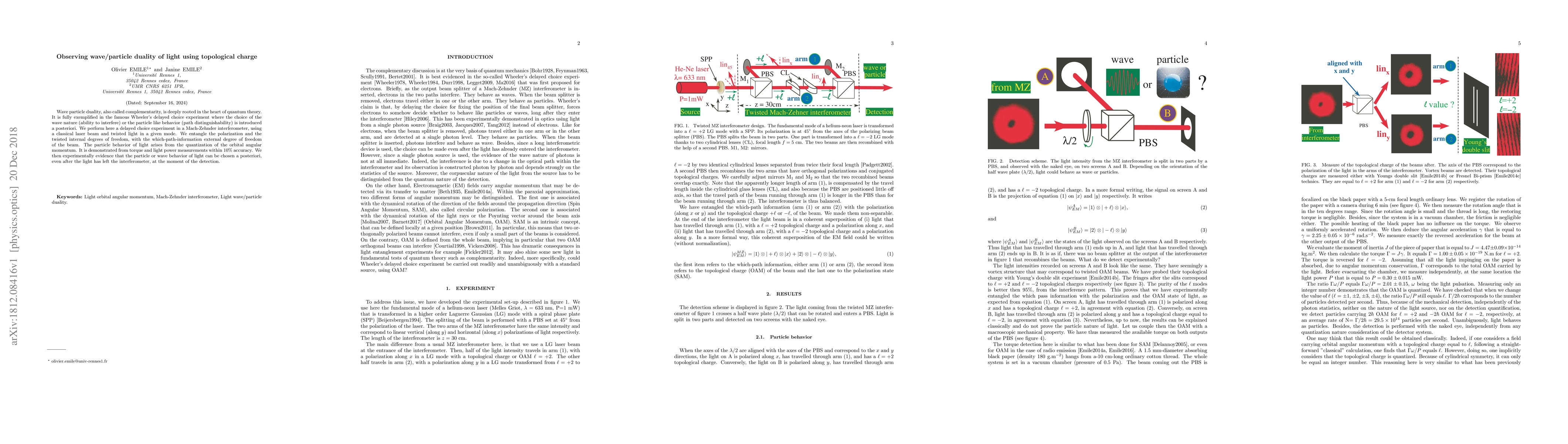 The study introduces a novel method for observing wave-particle duality using topological charge entanglement in a Mach-Zehnder interferometer setup.