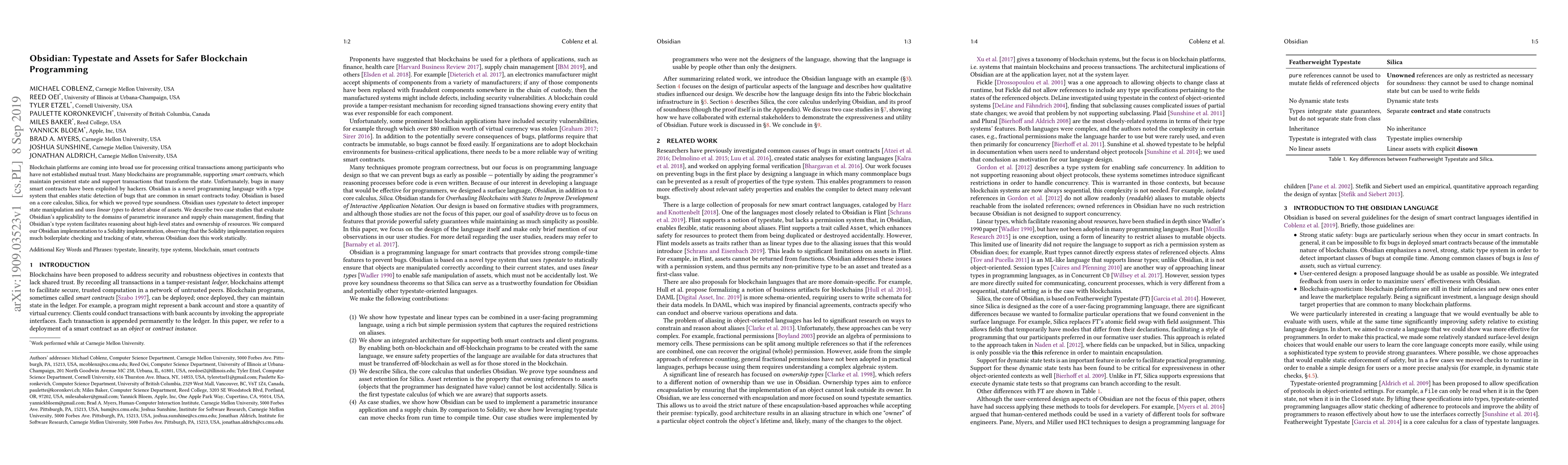 Obsidian is a novel blockchain programming language designed to detect common smart contract bugs statically through its typestate and asset management features. It employs a type system that includes linear types and typestate to prevent improper state manipulation and asset abuse, significantly reducing the need for runtime checks compared to Solidity.