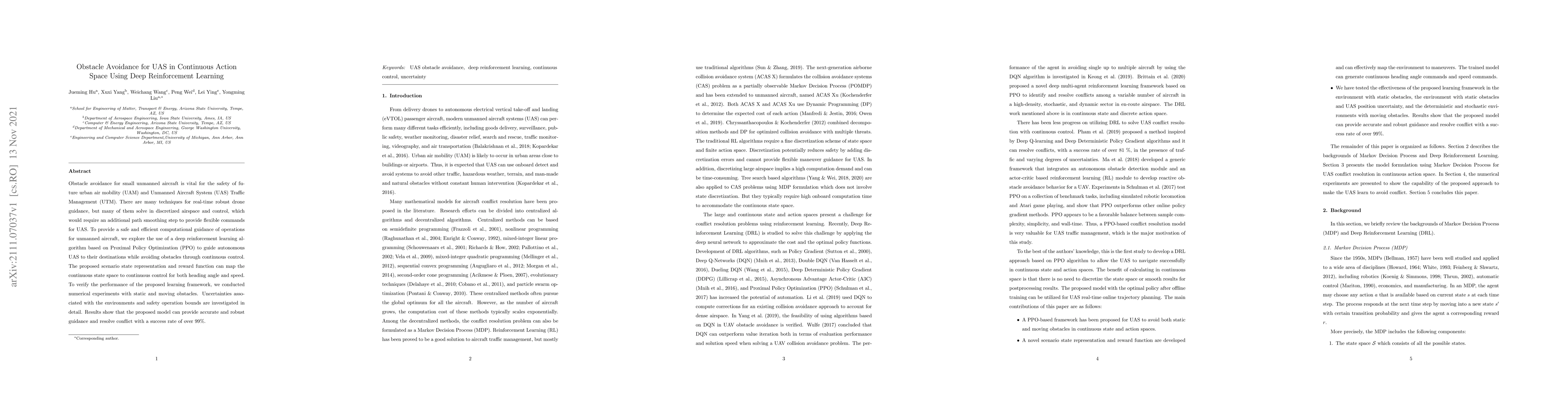 This paper proposes a deep reinforcement learning approach using Proximal Policy Optimization (PPO) for obstacle avoidance in continuous action space for unmanned aerial systems (UAS) in urban air mobility. The method achieves safe and efficient navigation by directly mapping continuous state space to continuous control, demonstrating over 99% success rate in numerical experiments with static and moving obstacles.