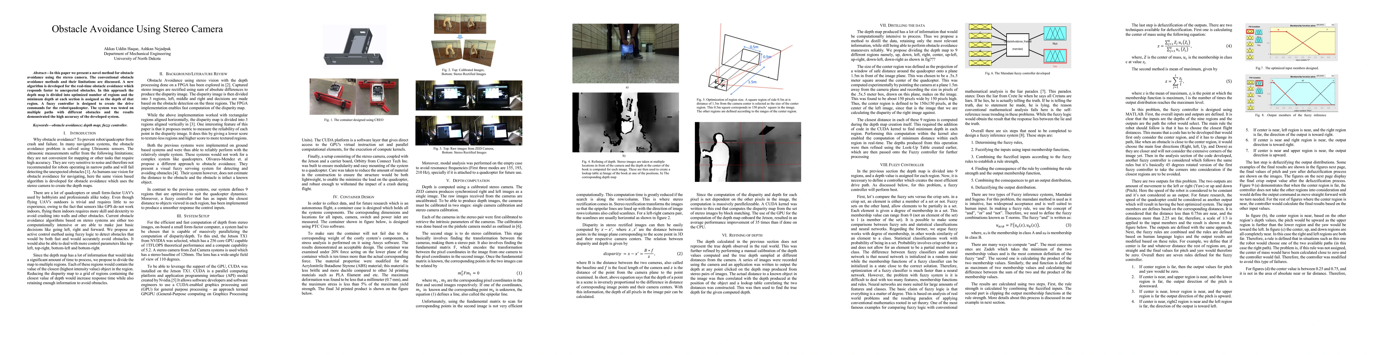 This paper introduces a novel method for real-time obstacle avoidance using a stereo camera, overcoming conventional limitations by employing a depth map division and fuzzy controller for precise navigation. The developed system was tested on various paths, showing high accuracy in avoiding unexpected obstacles.