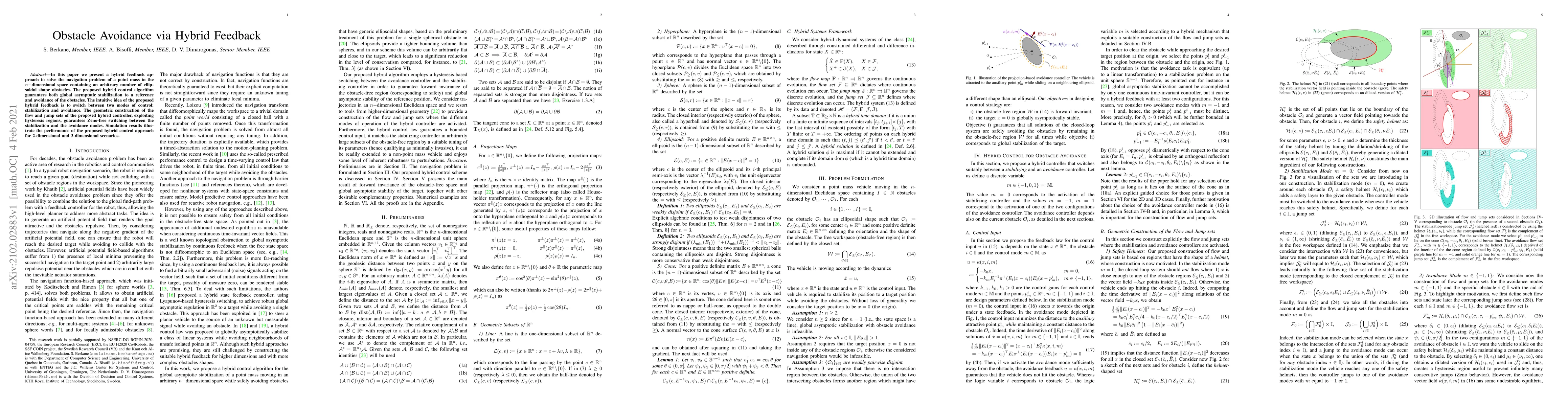 In this paper we present a hybrid feedback approach to solve the navigation problem of a point mass in the n-dimensional space containing an arbitrary number of ellipsoidal shape obstacles. The proposed hybrid control algorithm guarantees both global asymptotic stabilization to a reference and avoidance of the obstacles. The intuitive idea of the proposed hybrid feedback is to switch between two modes of control: stabilization and avoidance. The geometric construction of the flow and jump sets of the proposed hybrid controller, exploiting hysteresis regions, guarantees Zeno-free switching between the stabilization and the avoidance modes. Simulation results illustrate the performance of the proposed hybrid control approach for 2-dimensional and 3-dimensional scenarios.
