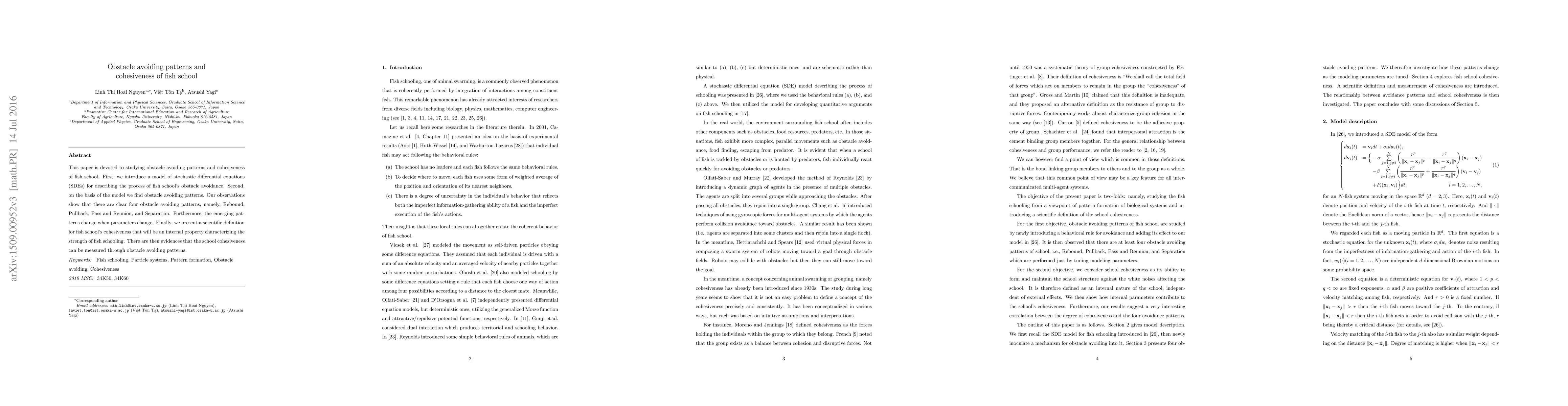 This paper models fish school obstacle avoidance using stochastic differential equations, identifying four main patterns: Rebound, Pullback, Pass, and Reunion, and Separation. It also defines a scientific measure for fish school cohesiveness, demonstrating that this cohesiveness can be inferred from the observed avoidance patterns.