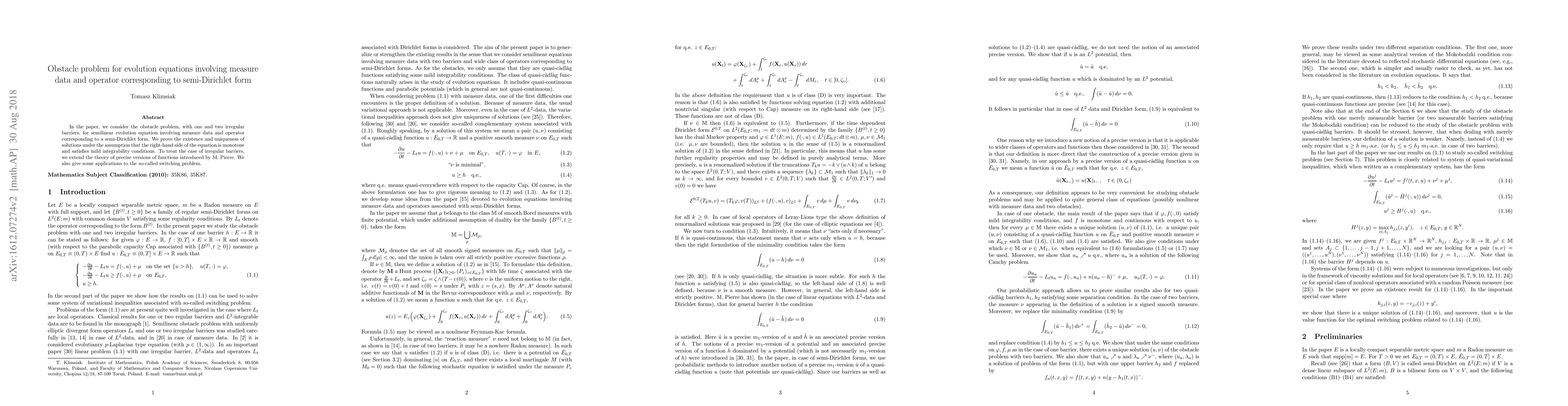 This paper investigates the obstacle problem for semilinear evolution equations with measure data and a semi-Dirichlet form operator, proving existence and uniqueness of solutions under monotonicity and integrability conditions. It extends M. Pierre's theory for irregular barriers and applies the results to the switching problem.