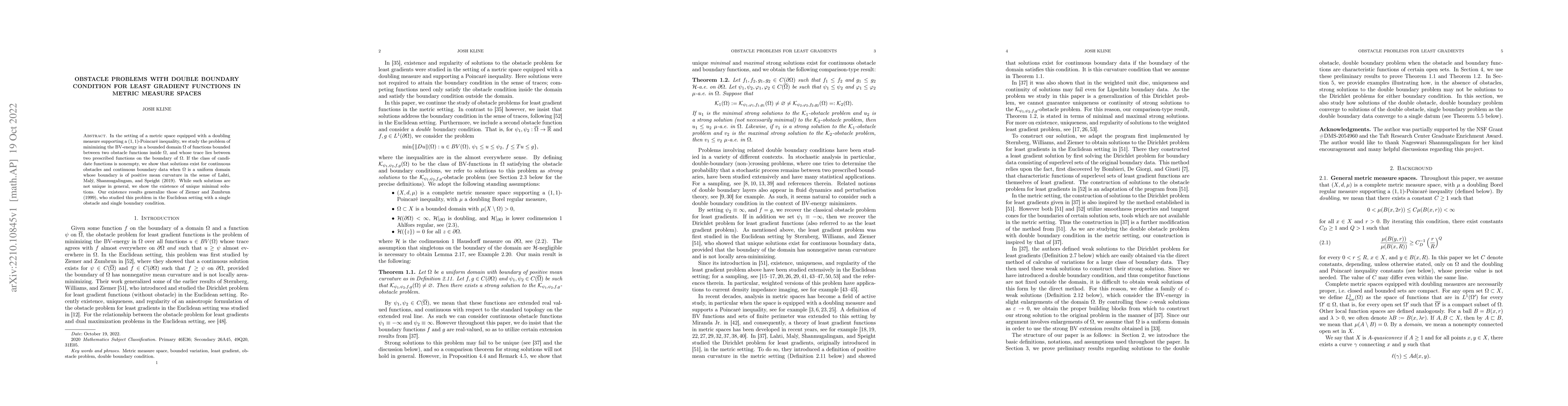 This paper investigates the existence of solutions for least gradient functions in metric measure spaces under double boundary conditions and obstacles. It proves the existence of unique minimal solutions for continuous obstacles and boundary conditions, generalizing previous results from the Euclidean setting.