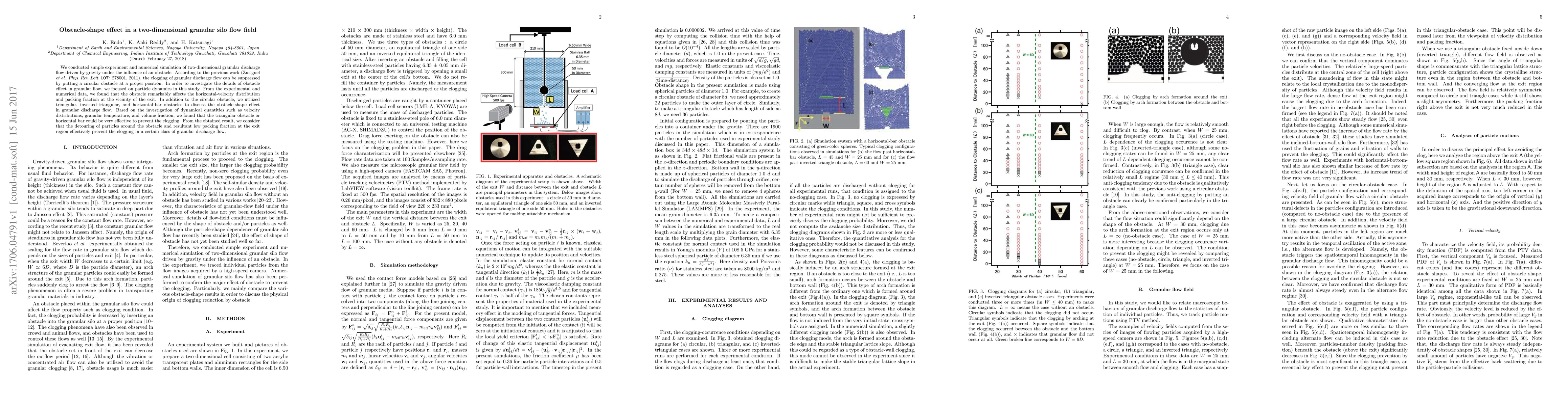 This study investigates the effect of various obstacle shapes on the flow dynamics of granular materials in a two-dimensional silo, finding that triangular and horizontal bar obstacles significantly reduce clogging by altering particle velocity distribution and packing fraction near the exit. The results suggest that particle detouring around obstacles leads to lower packing fractions, effectively preventing clogging.